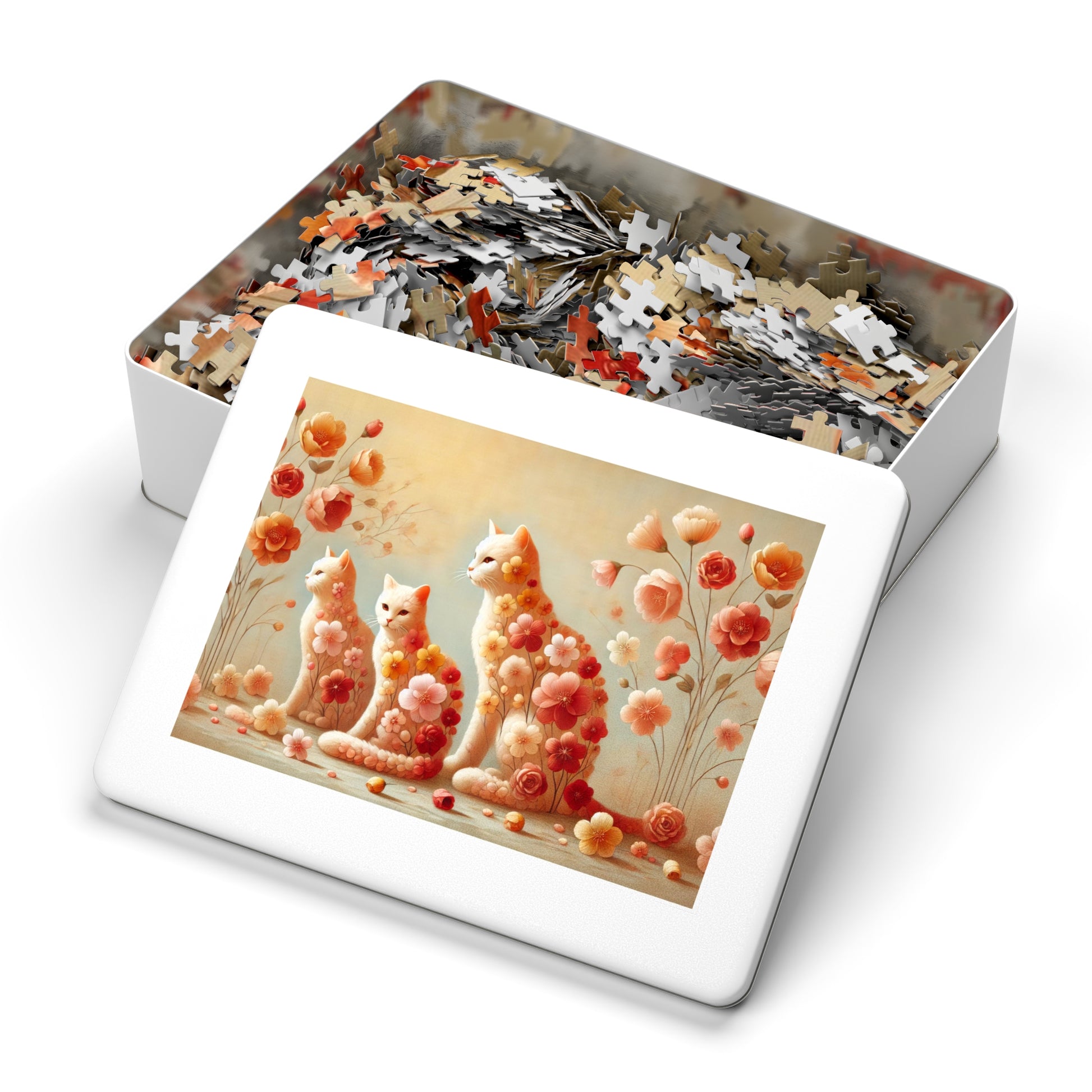 Three ivory cats sit amid a garden of hand-painted blossoms—peach, apricot, and vermilion—petals weaving into their fur like living embroidery. The palette is warm and serene, the light tender and airy, turning a quiet moment into a lyrical tableau.