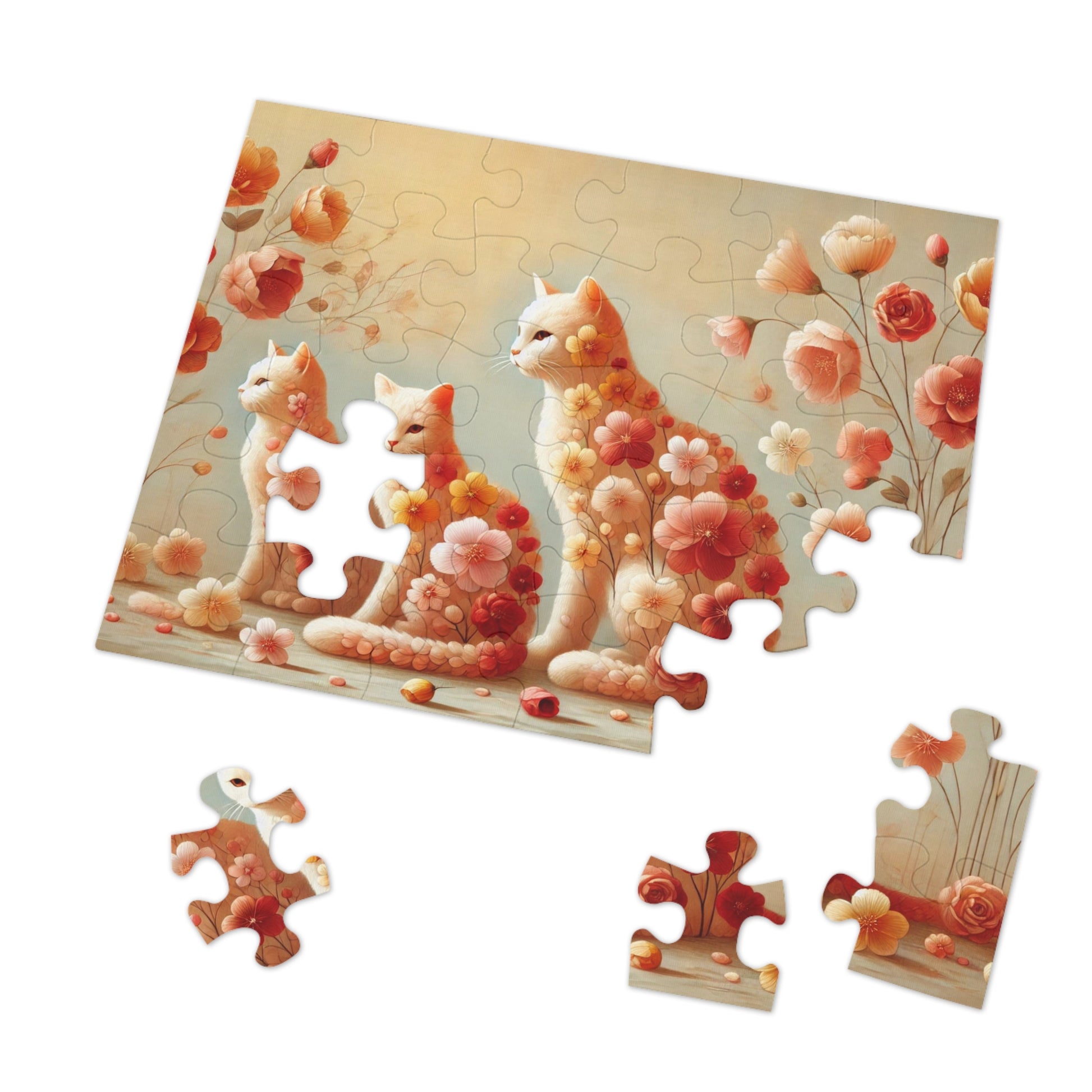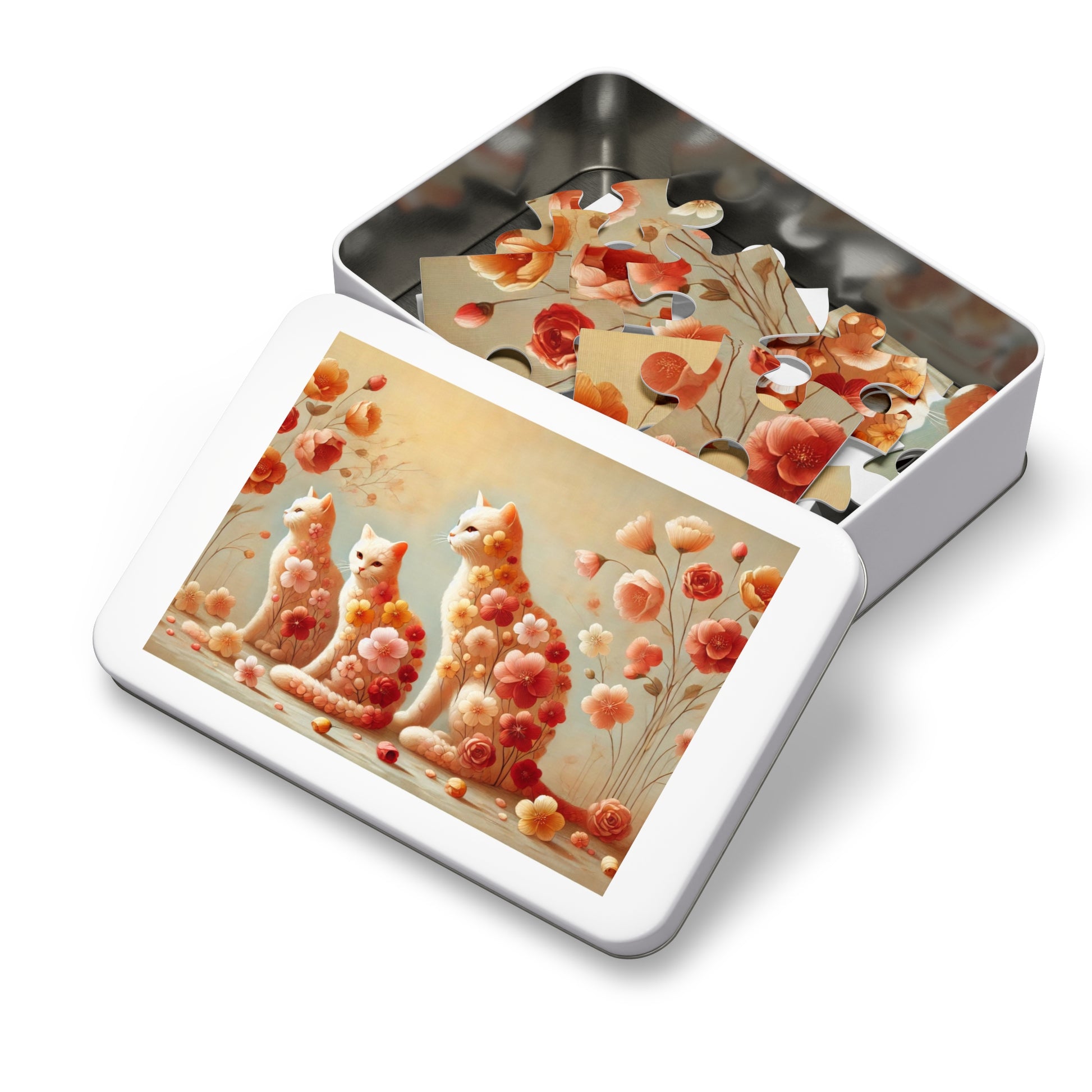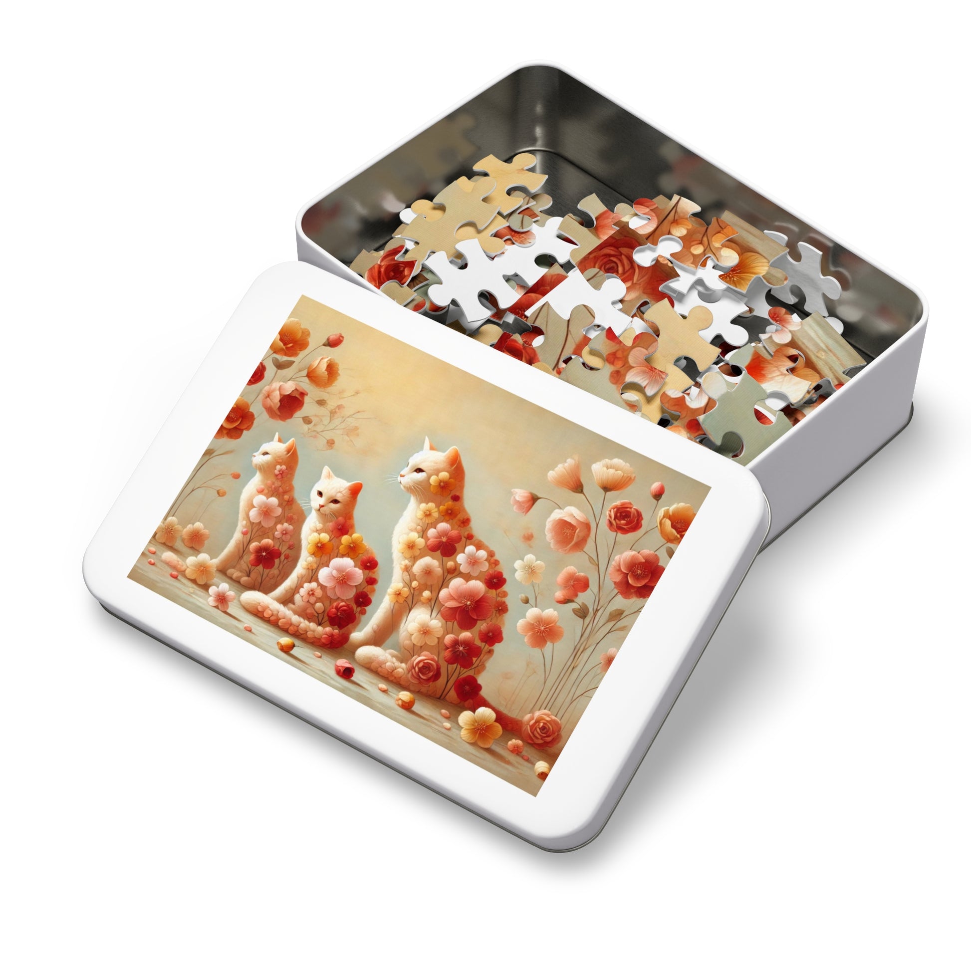 Natural zones—three cats, left/right floral sprays, scattered petals, and soft backdrop—make sorting intuitive. Repeating flower shapes provide a soothing rhythm from edge to edge.