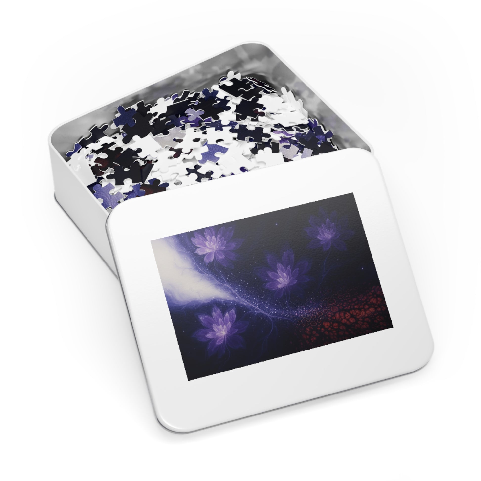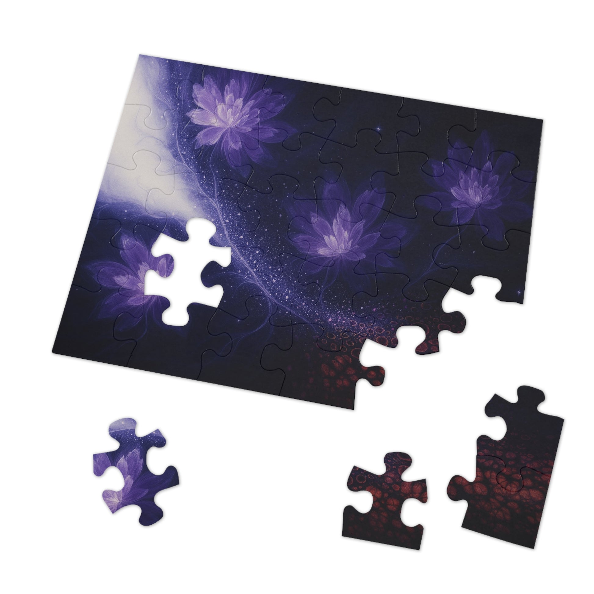 The interplay of violet blooms, moonlit silver, and star-flecked darkness evokes calm, wonder, and transcendence. It is more than a puzzle—it is a glimpse into the quiet elegance of a celestial garden.