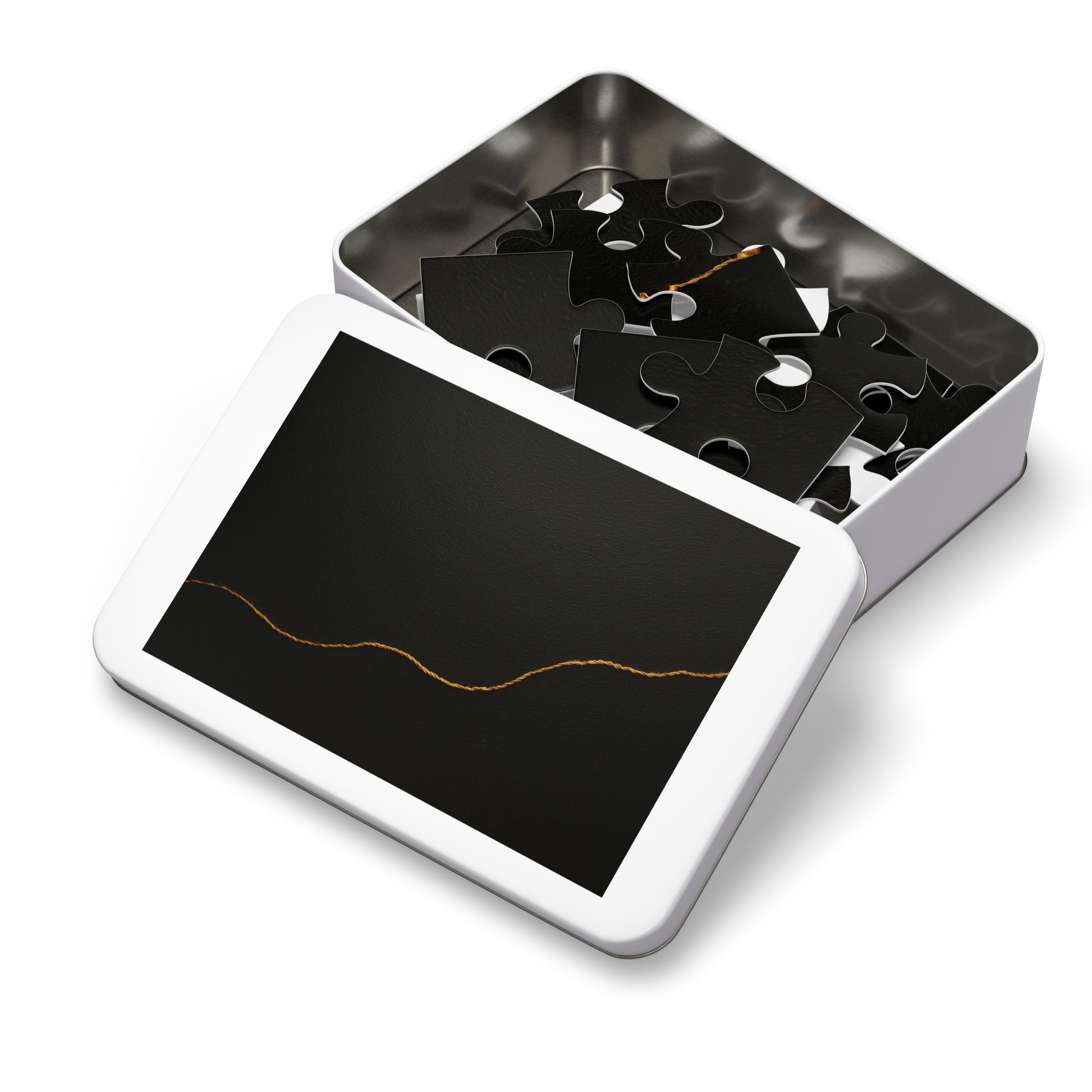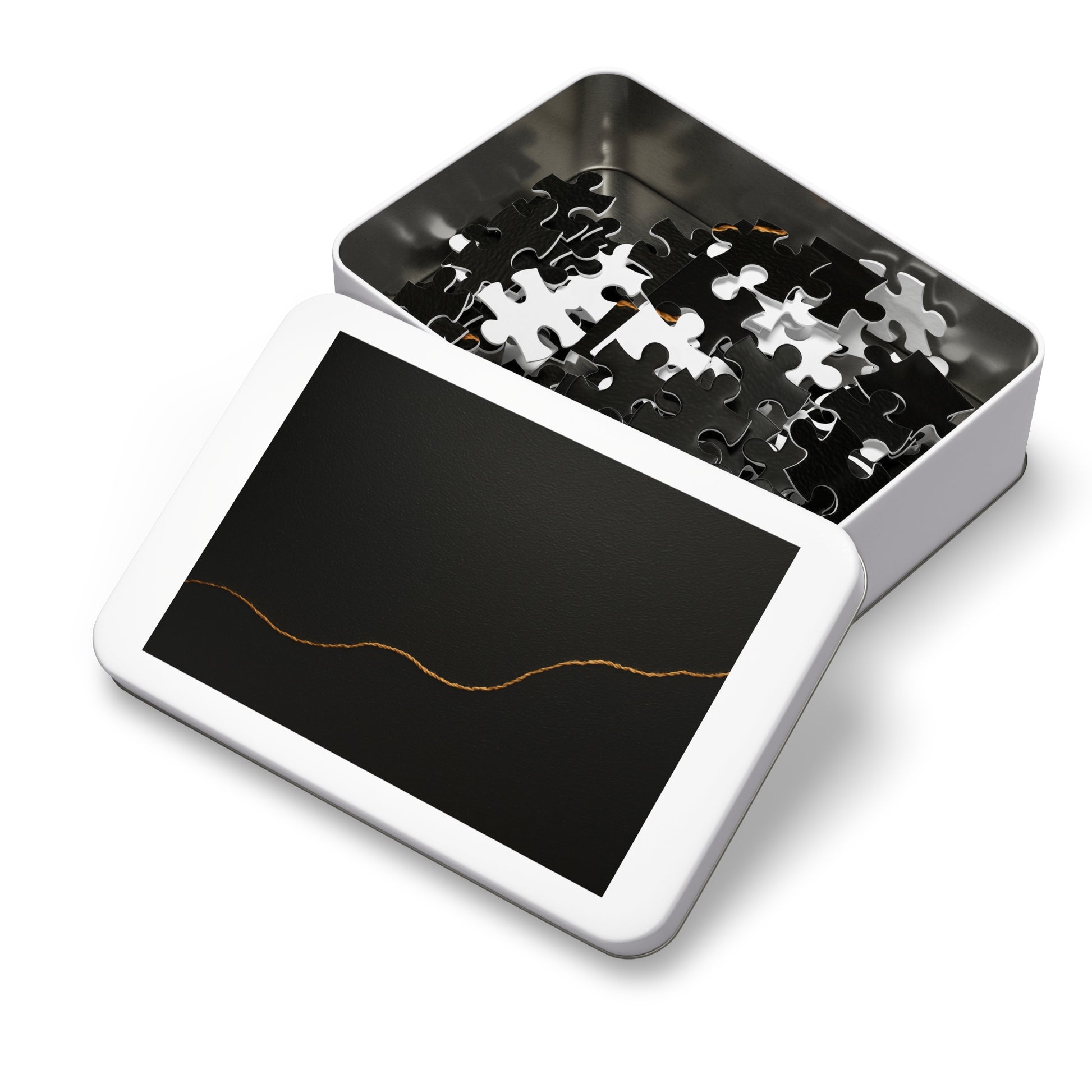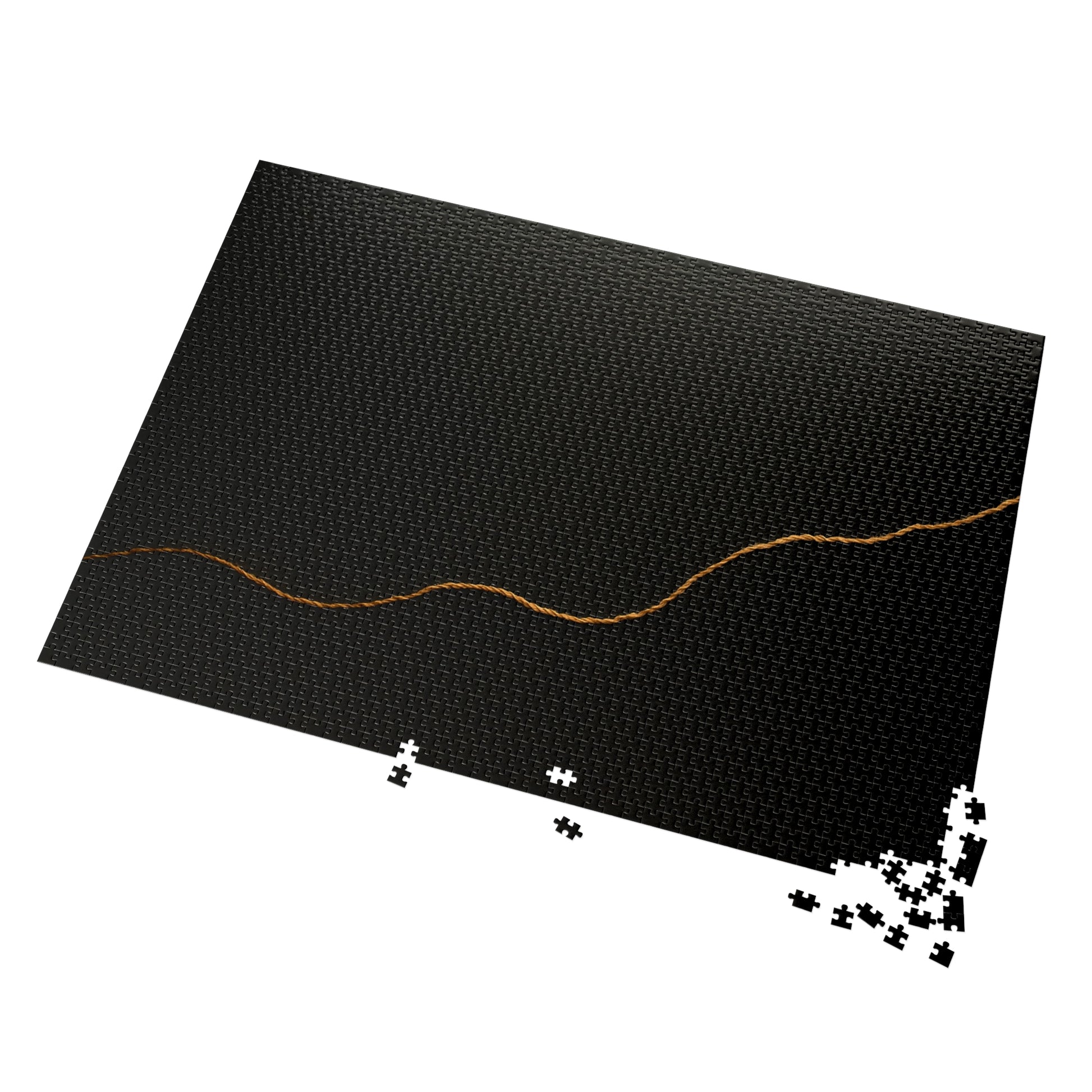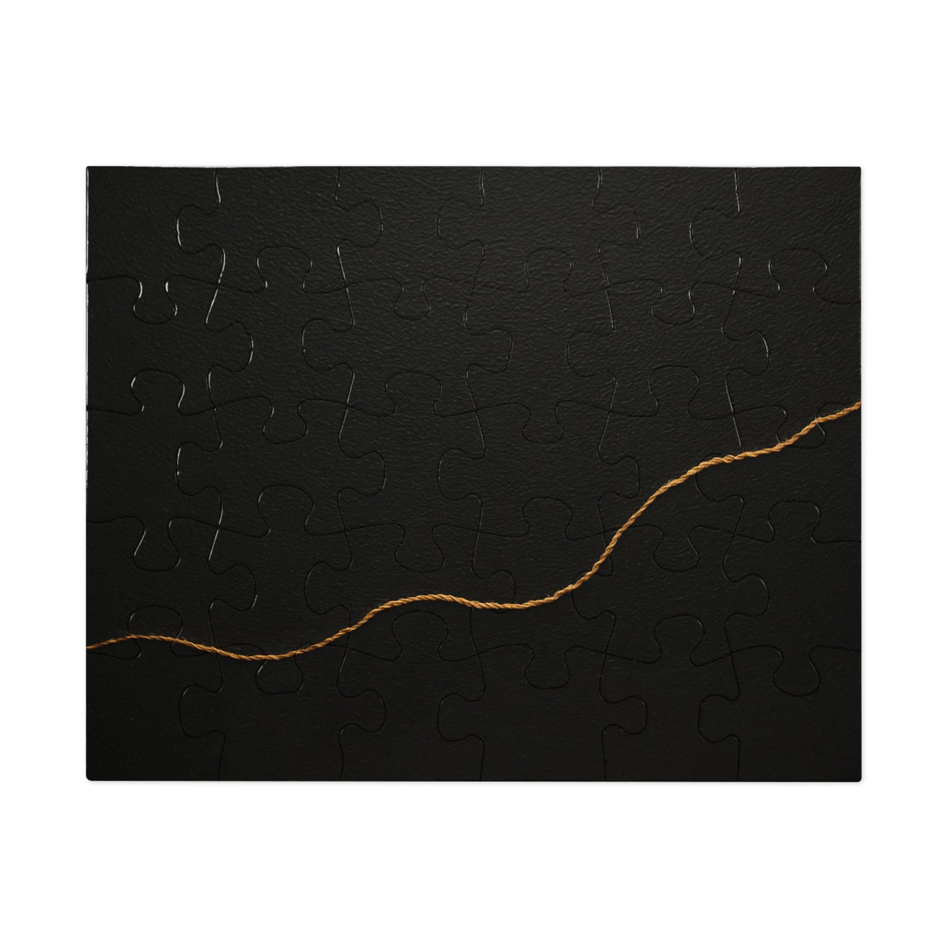Minimalist kintsugi energy—one luminous faultline against quiet, tactile black. Subtle texture makes pieces readable while preserving a refined, gallery feel.