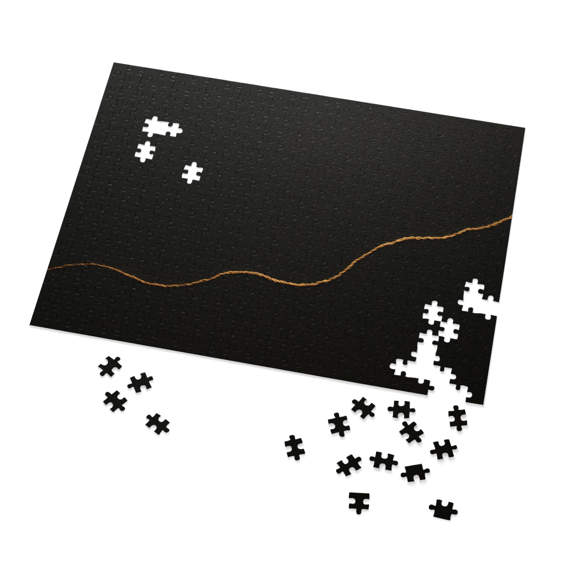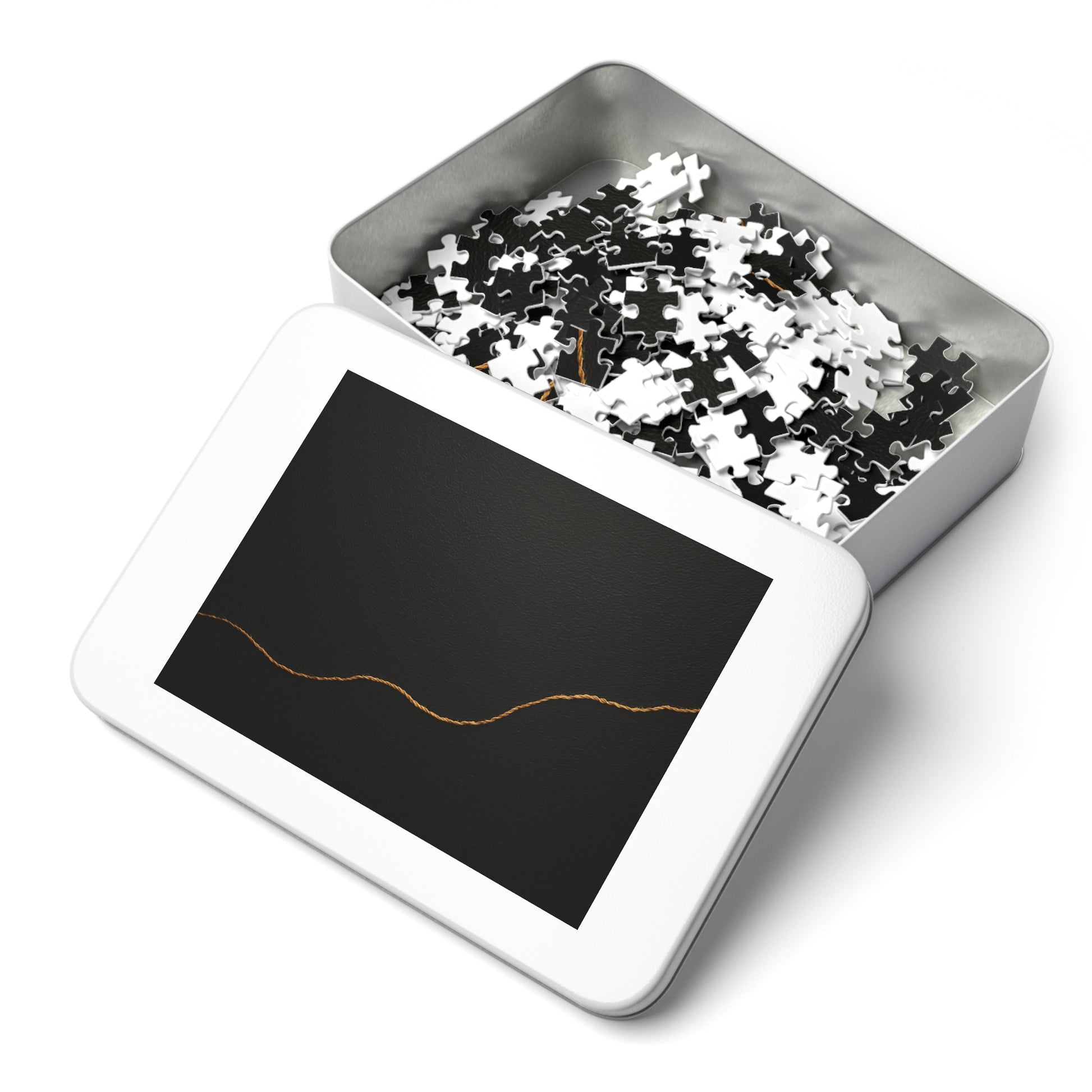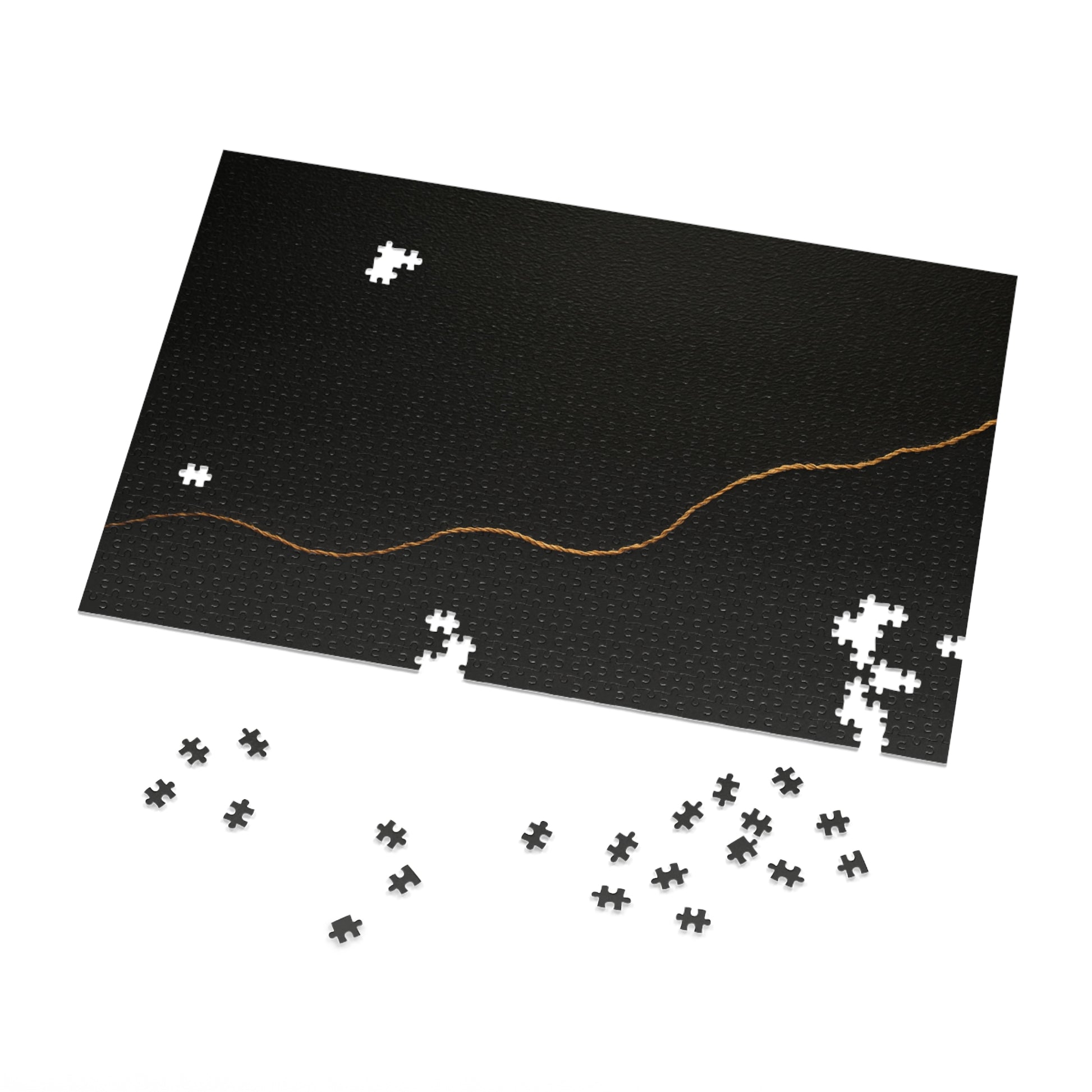 Minimalist kintsugi energy—one luminous faultline against quiet, tactile black. Subtle texture makes pieces readable while preserving a refined, gallery feel.