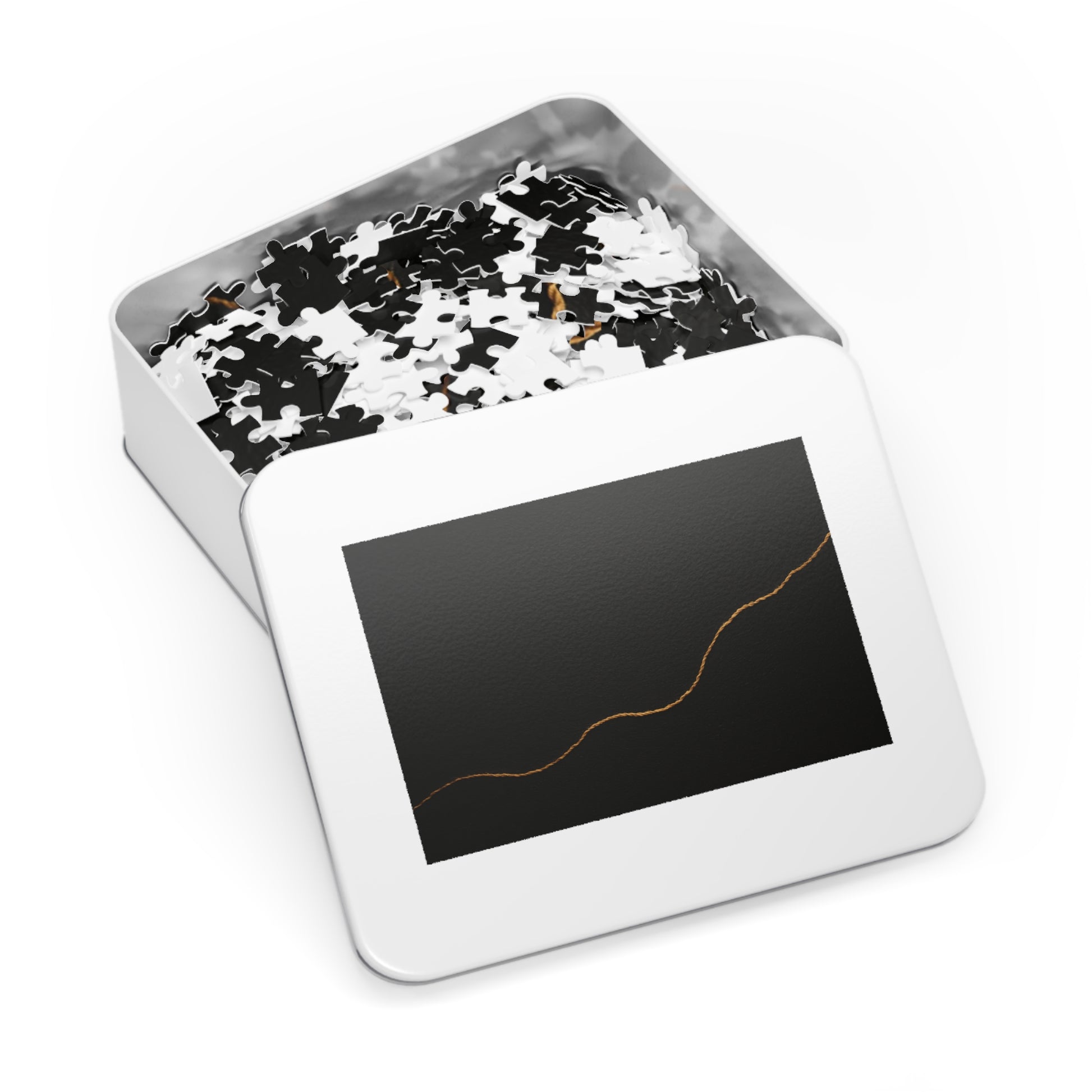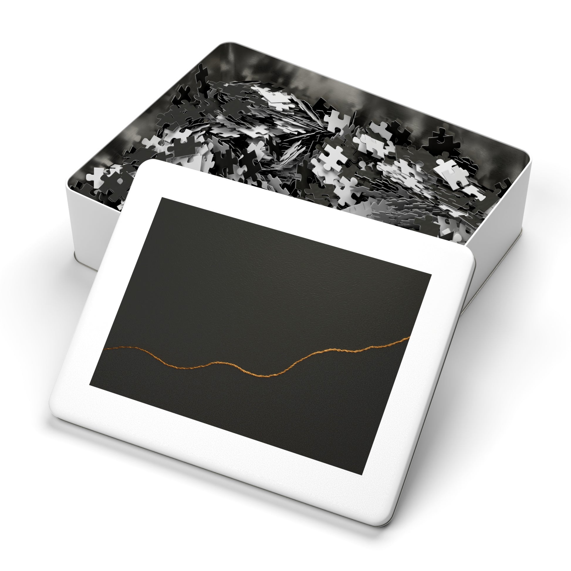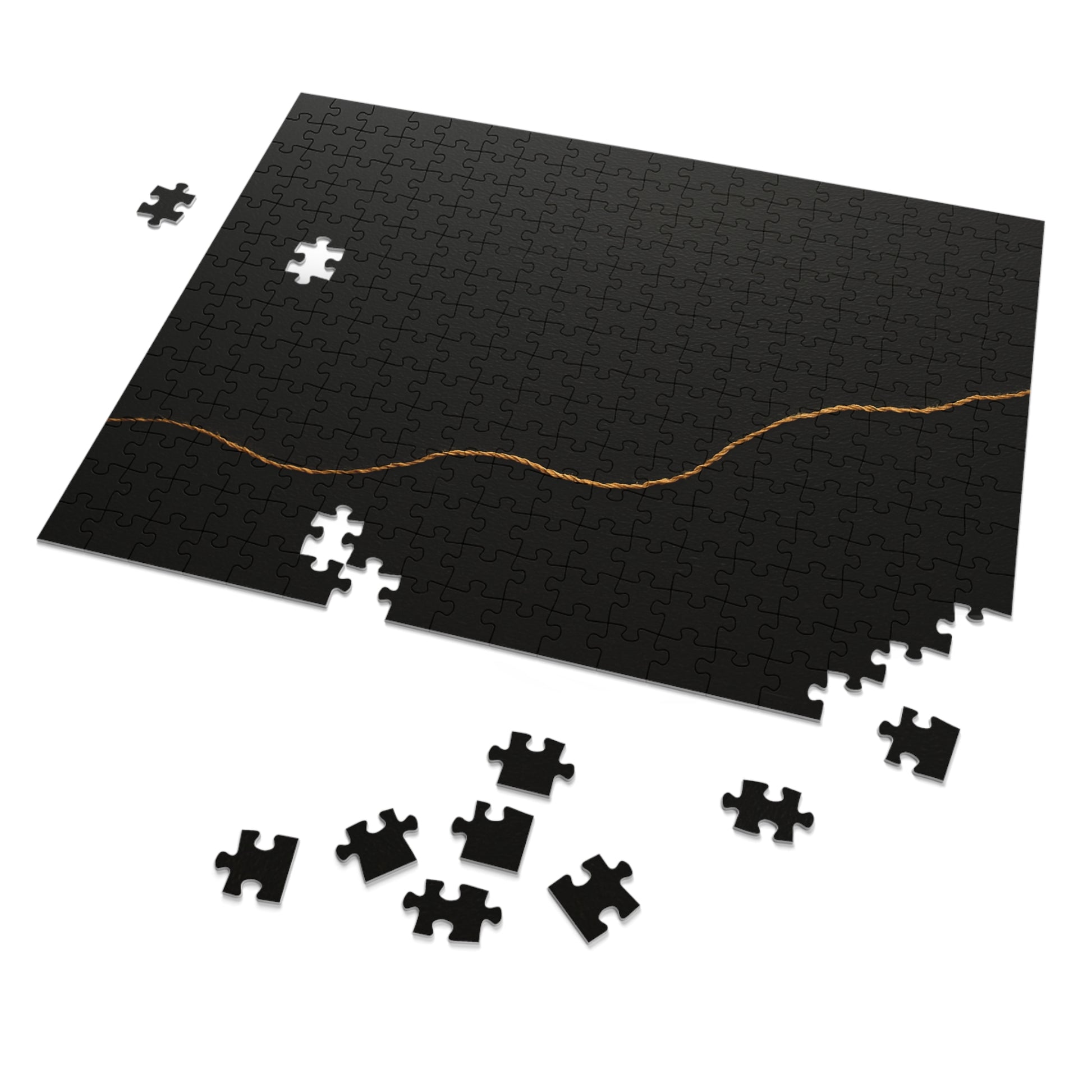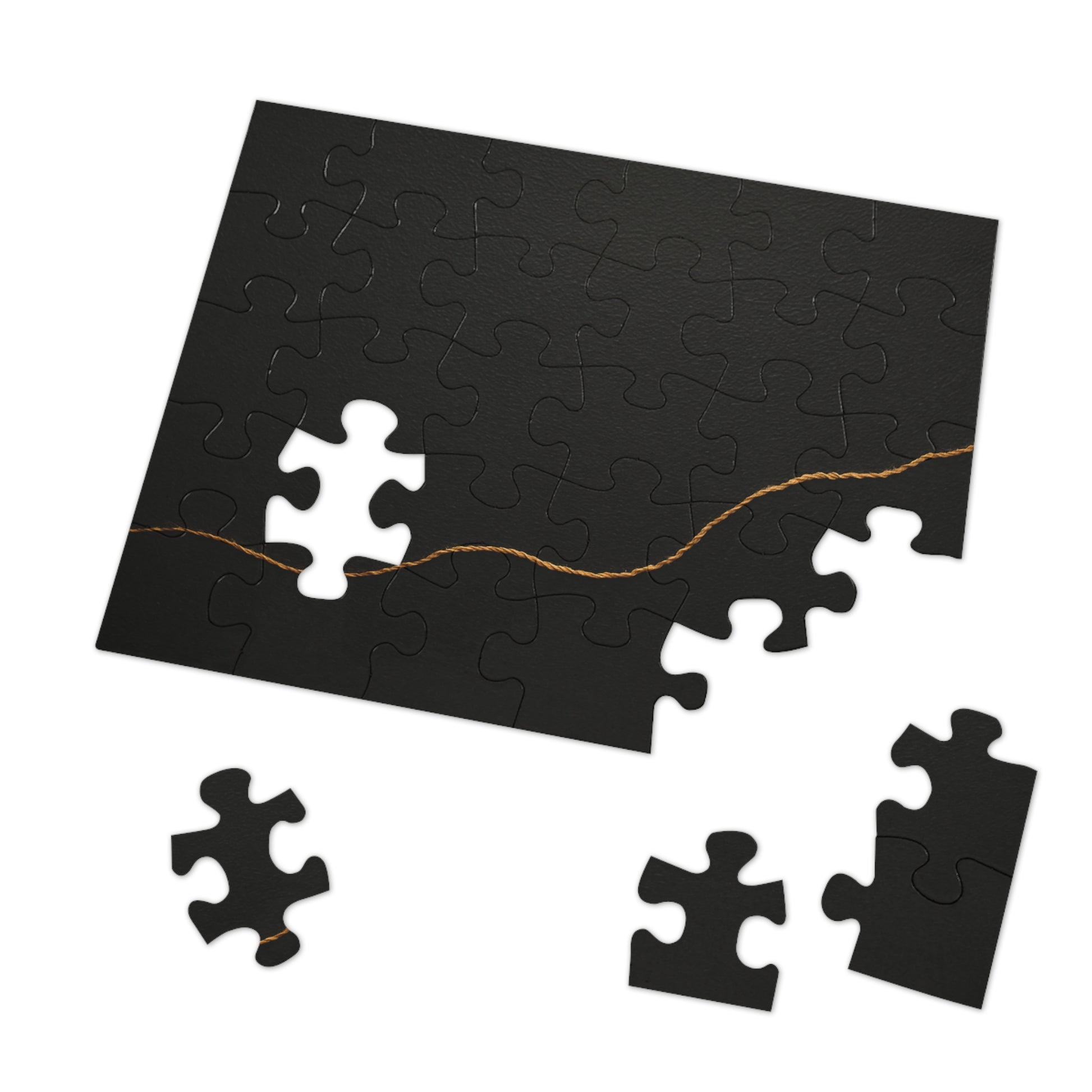 Minimalist kintsugi energy—one luminous faultline against quiet, tactile black. Subtle texture makes pieces readable while preserving a refined, gallery feel.