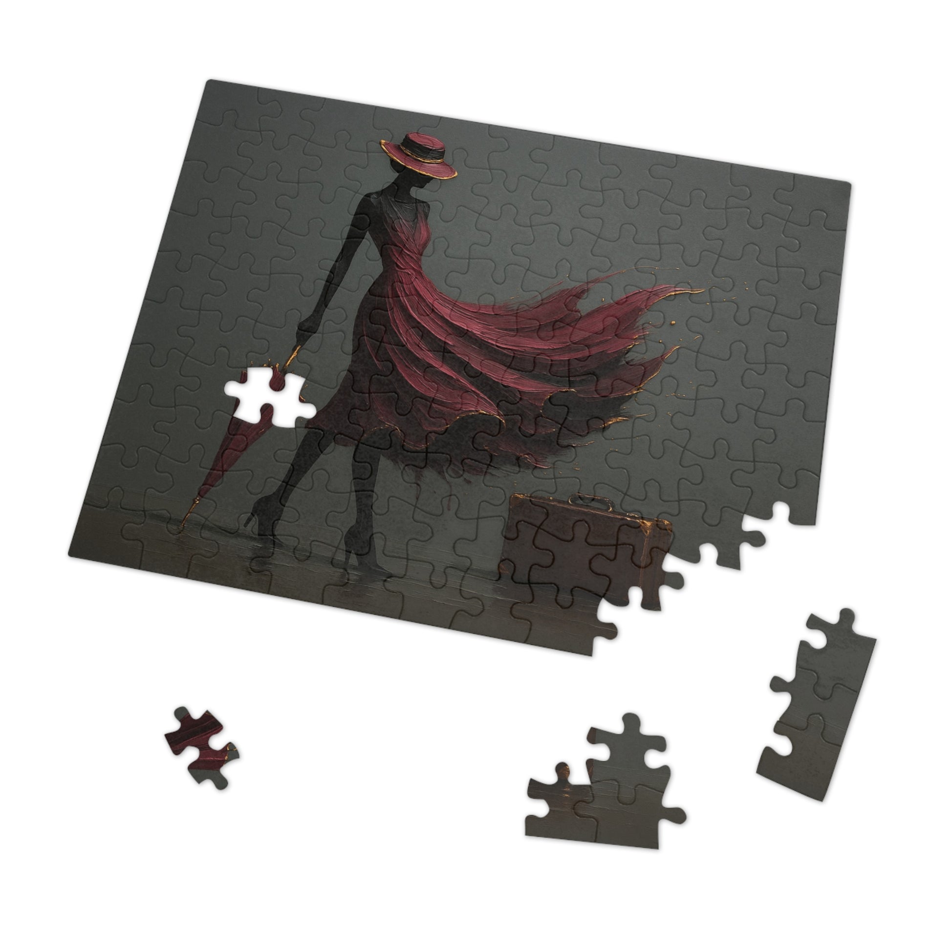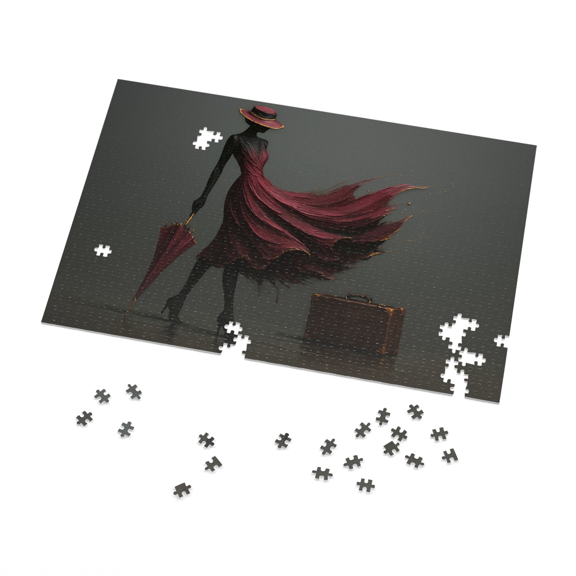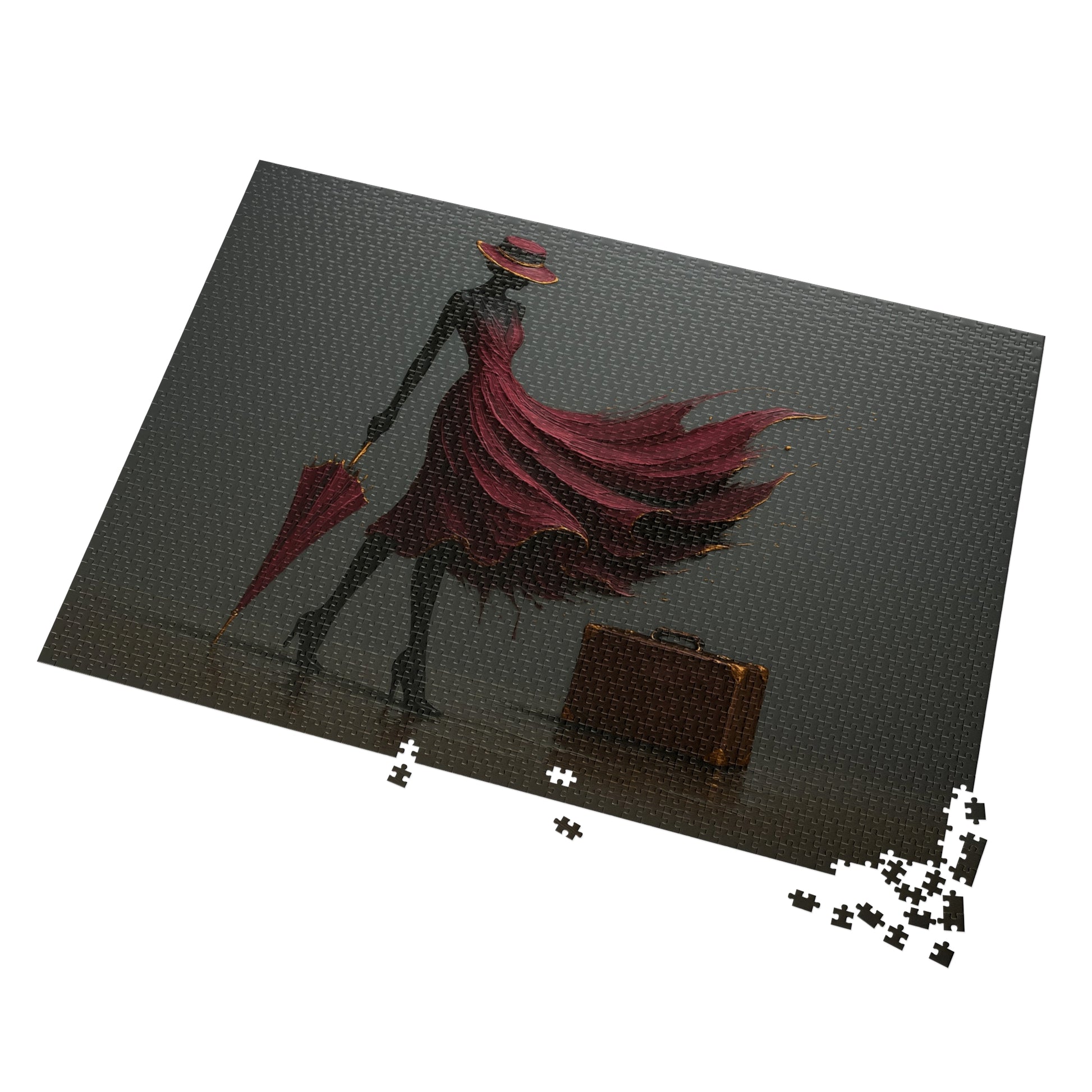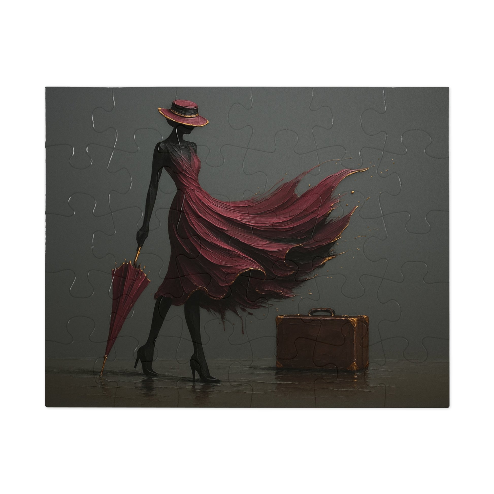 Against a smoky-grey field, a tall figure steps forward in a plum dress that breaks into ribbon-like cascades. Gold sparks skim the hem and hat brim; a vintage suitcase sits nearby as a plum umbrella taps the floor—stylish, minimal, and cinematic.