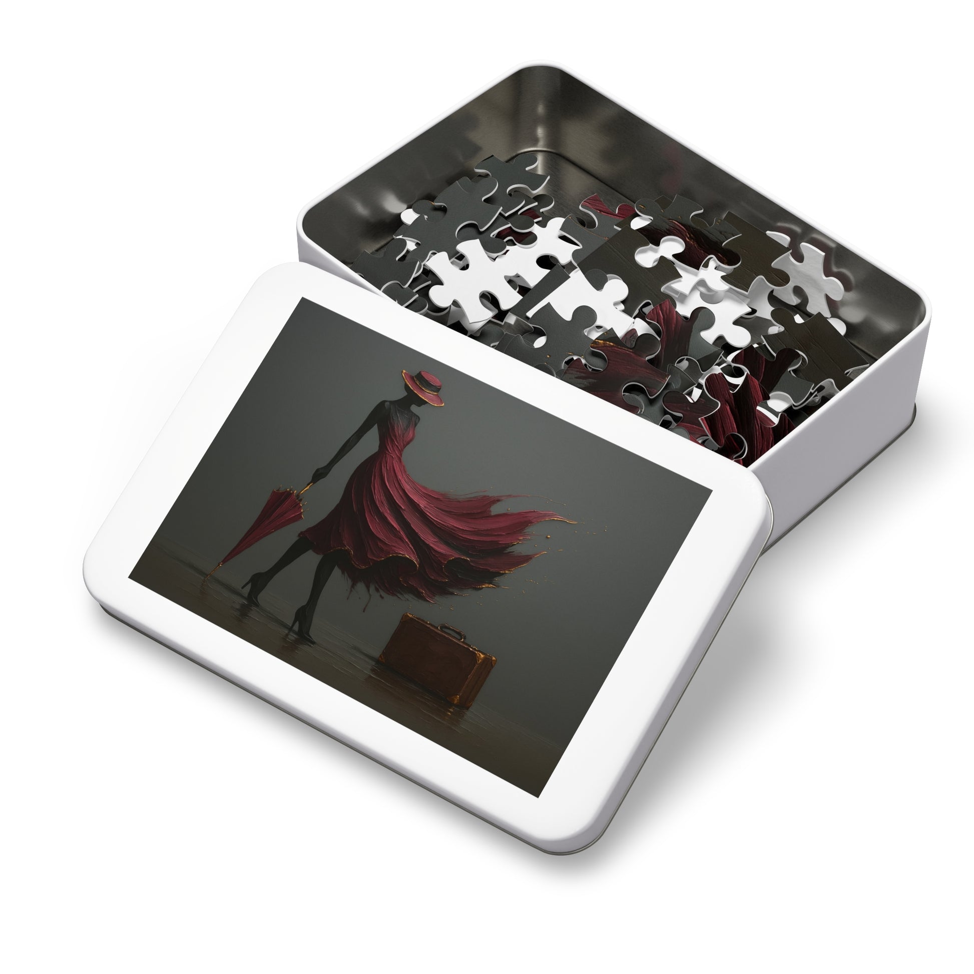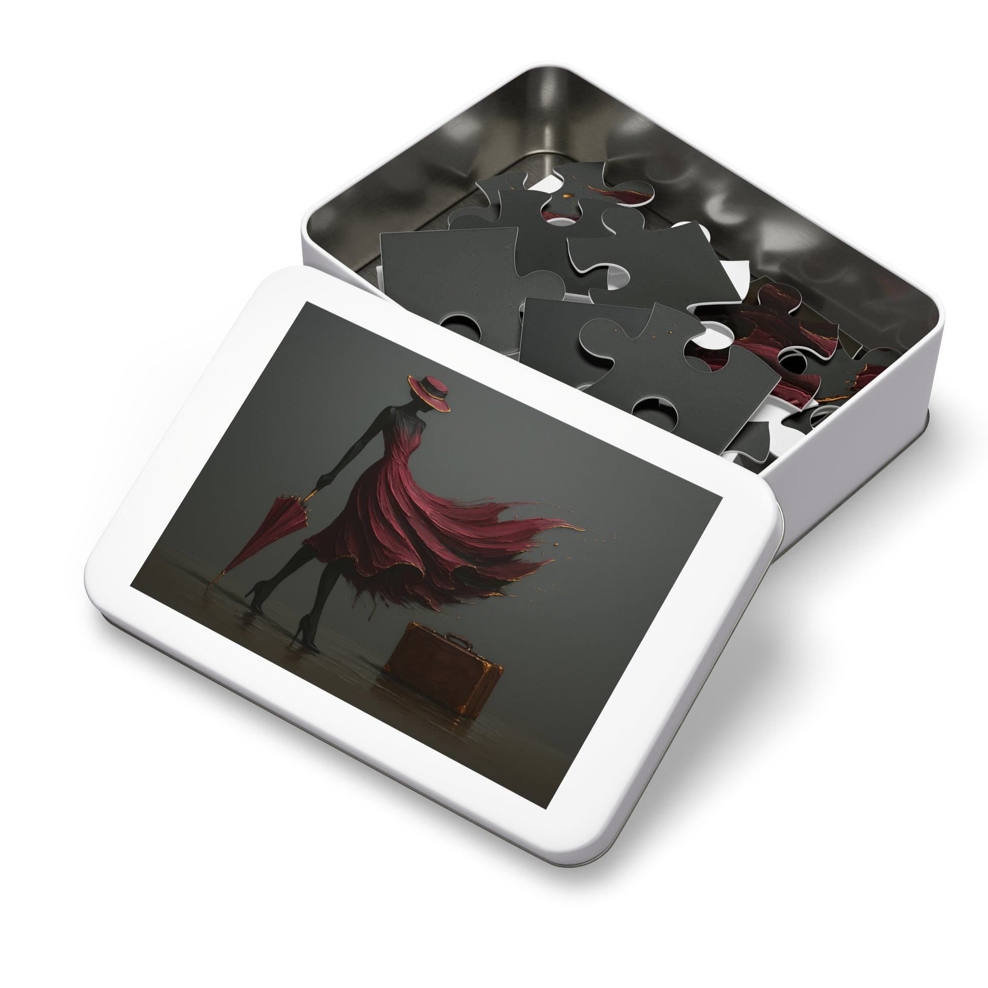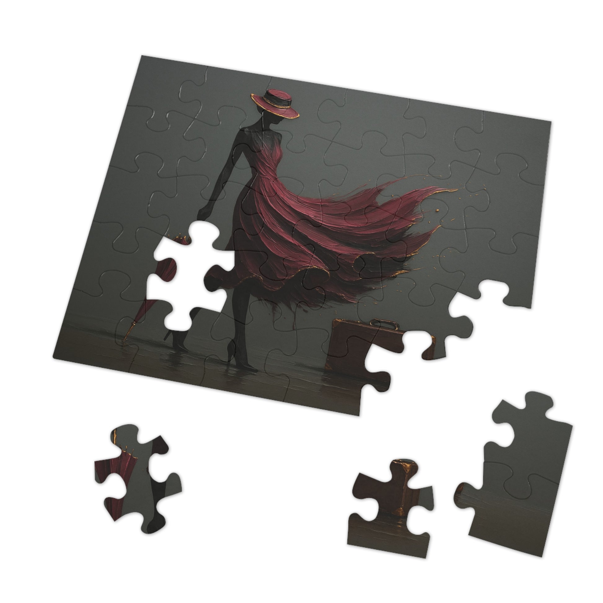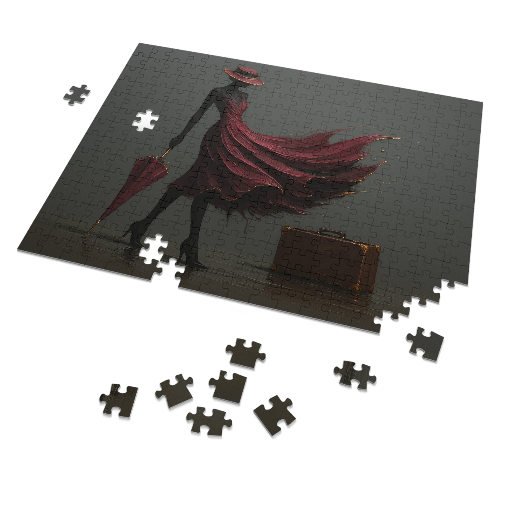 Against a smoky-grey field, a tall figure steps forward in a plum dress that breaks into ribbon-like cascades. Gold sparks skim the hem and hat brim; a vintage suitcase sits nearby as a plum umbrella taps the floor—stylish, minimal, and cinematic.