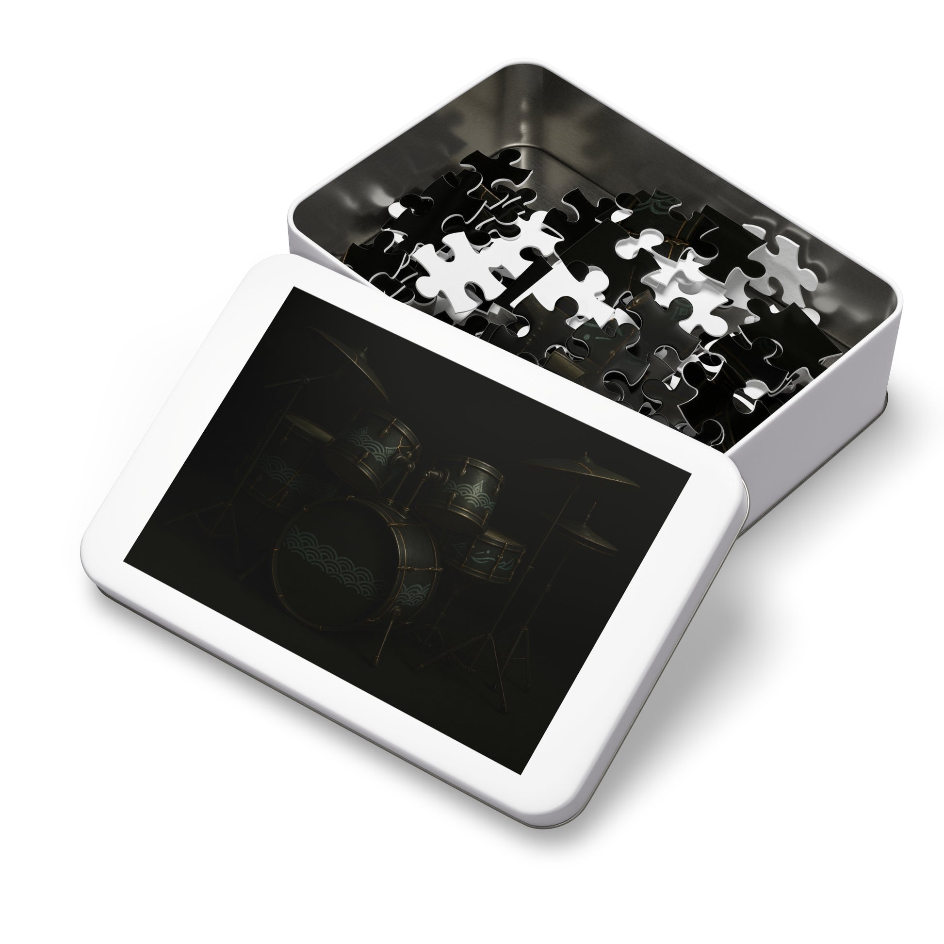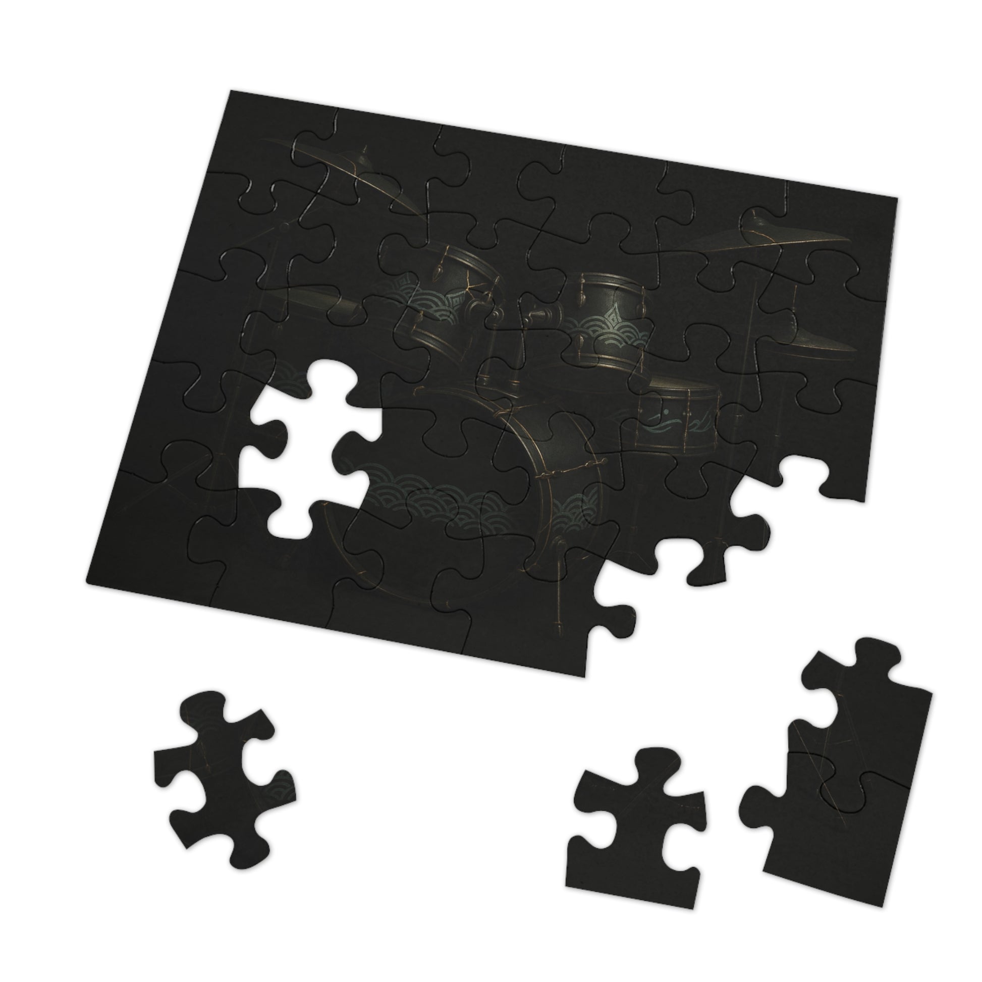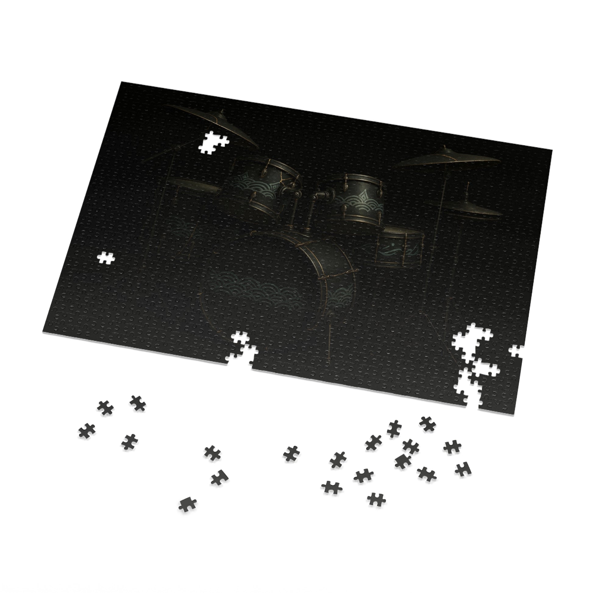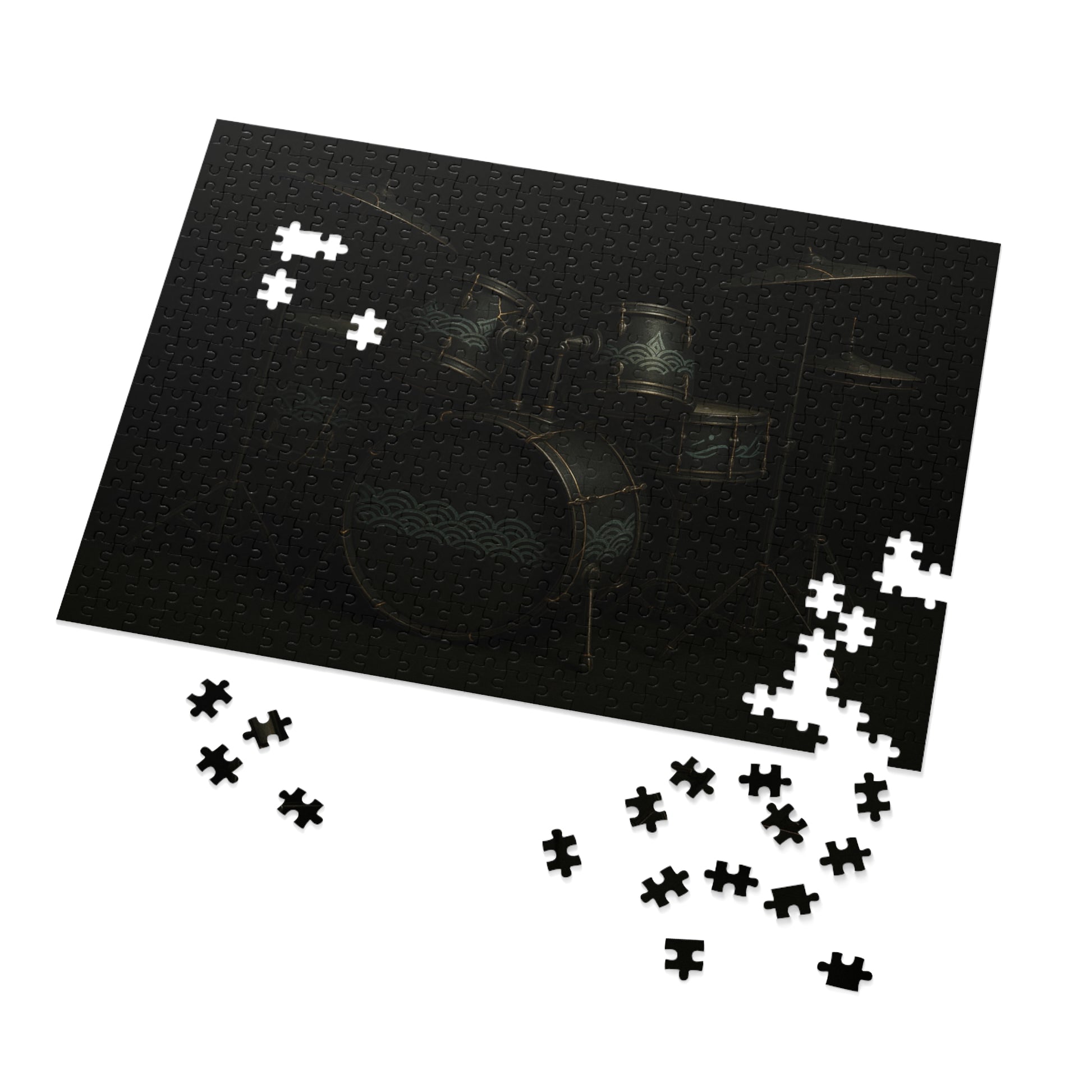 Clear assembly zones—cymbals, toms, snare, bass shell, and negative space—make sorting intuitive. Repeating seigaiha arcs and kintsugi lines provide steady visual beats.