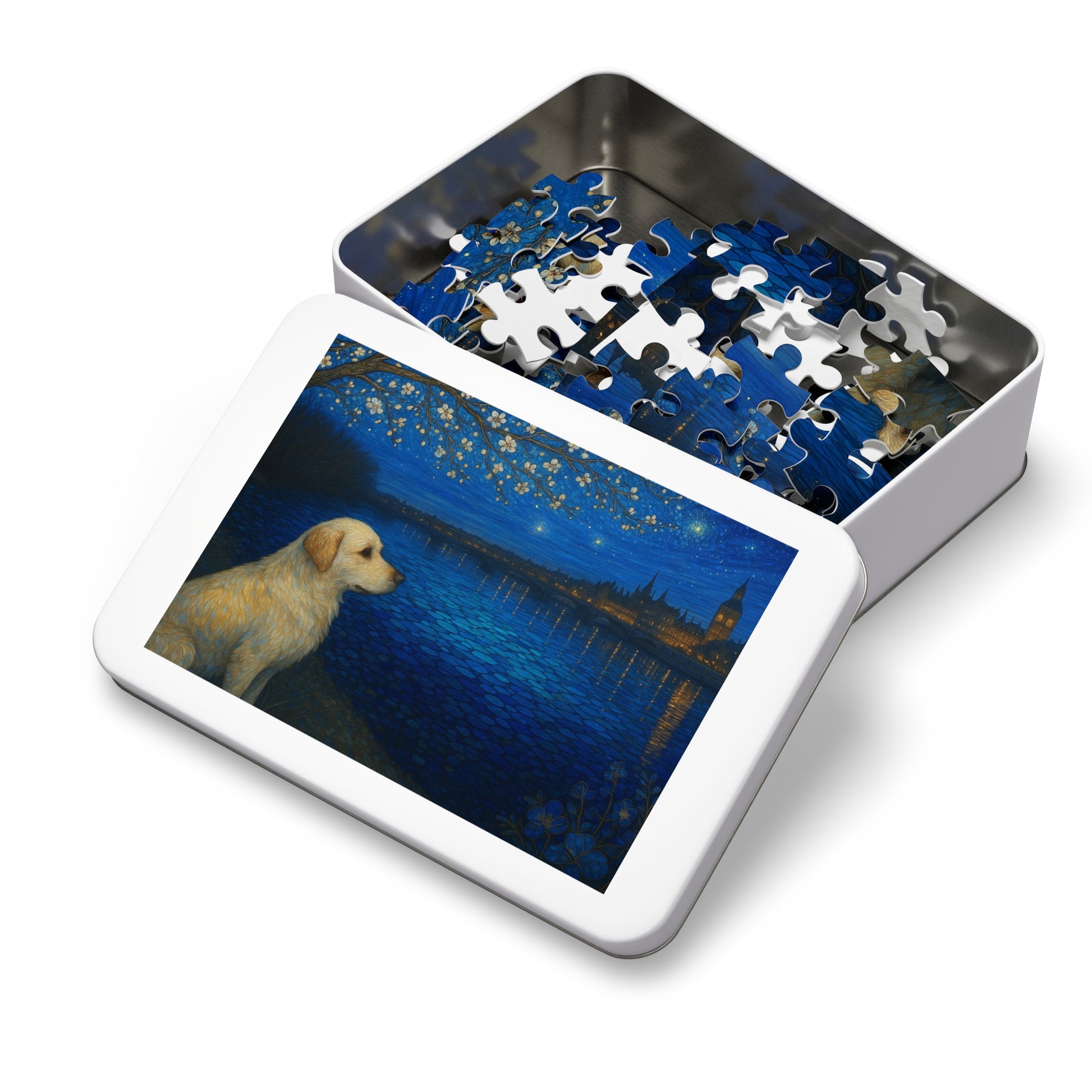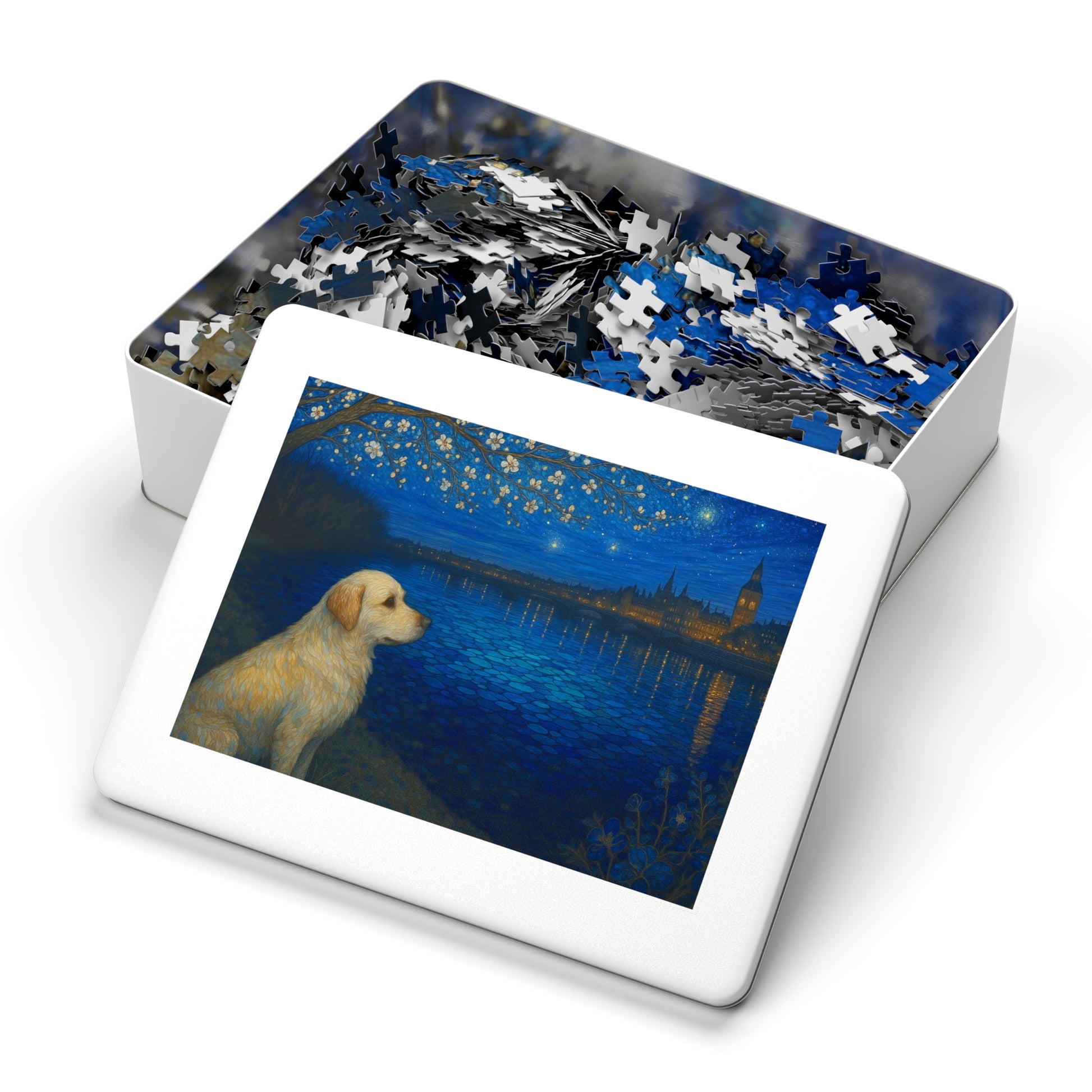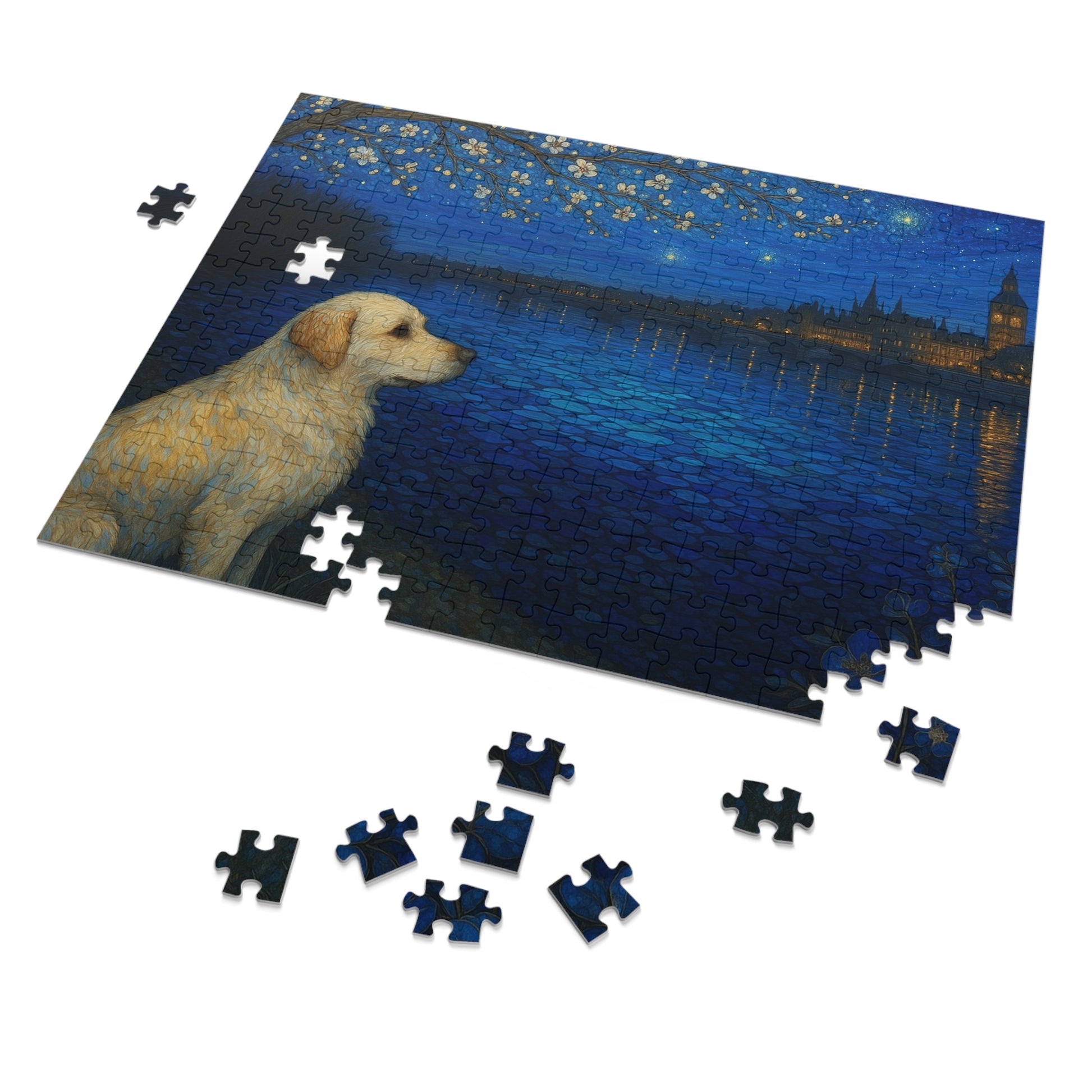 On a quiet embankment, a golden dog watches the Thames glow—swirls of starlight ripple across blue water, cherry blossoms arc overhead, and warm city lights span the bridge beyond. Calm, tender, and richly textured, this nightscape balances intimacy with grandeur.