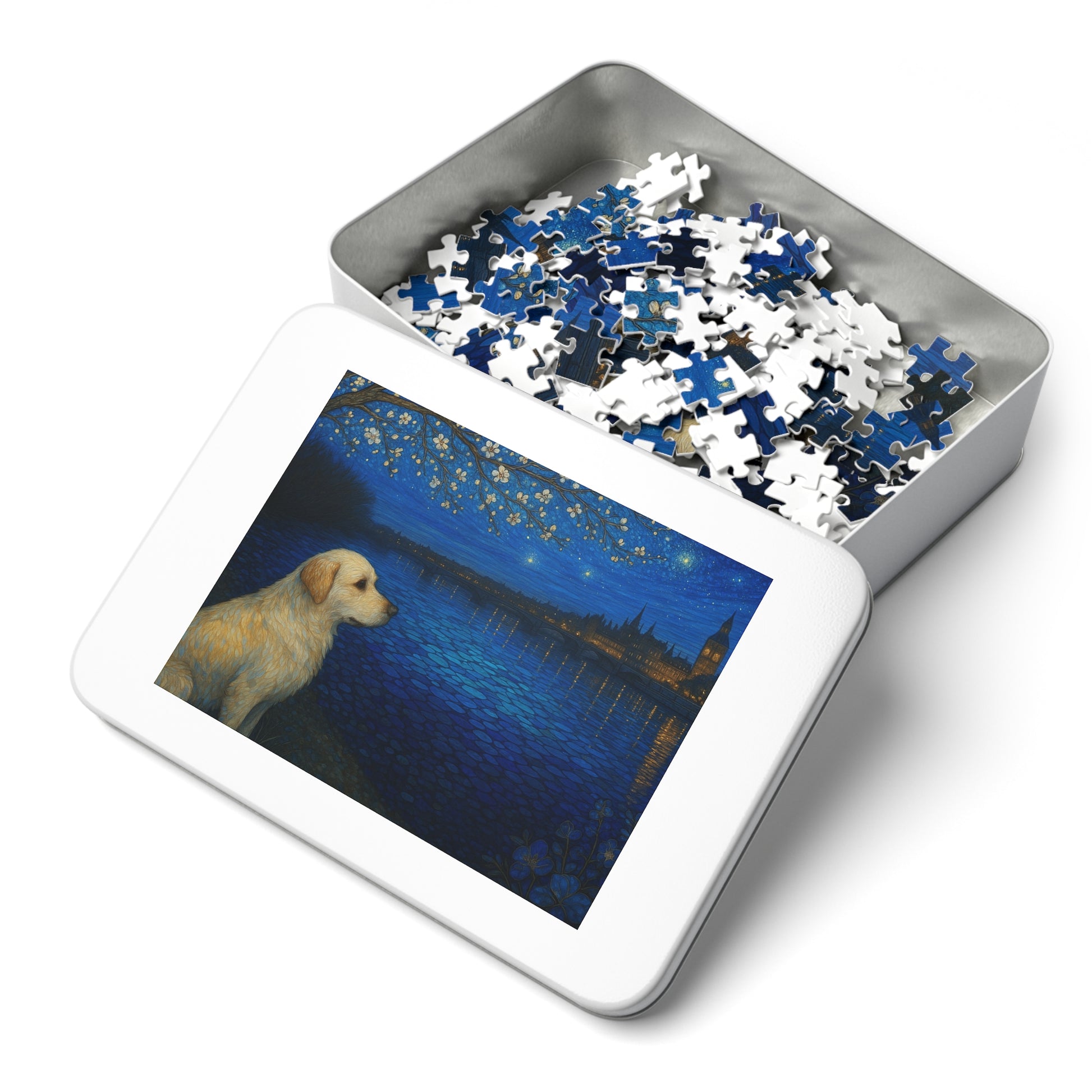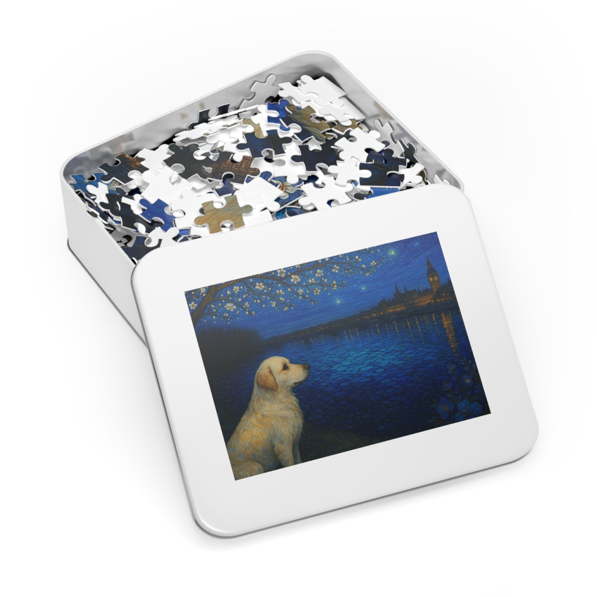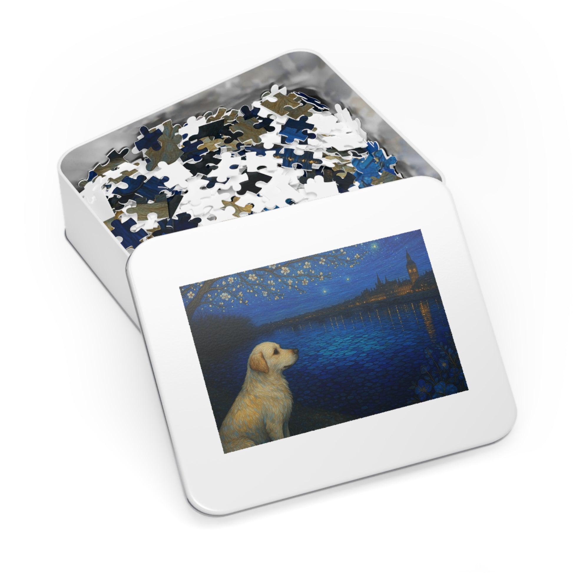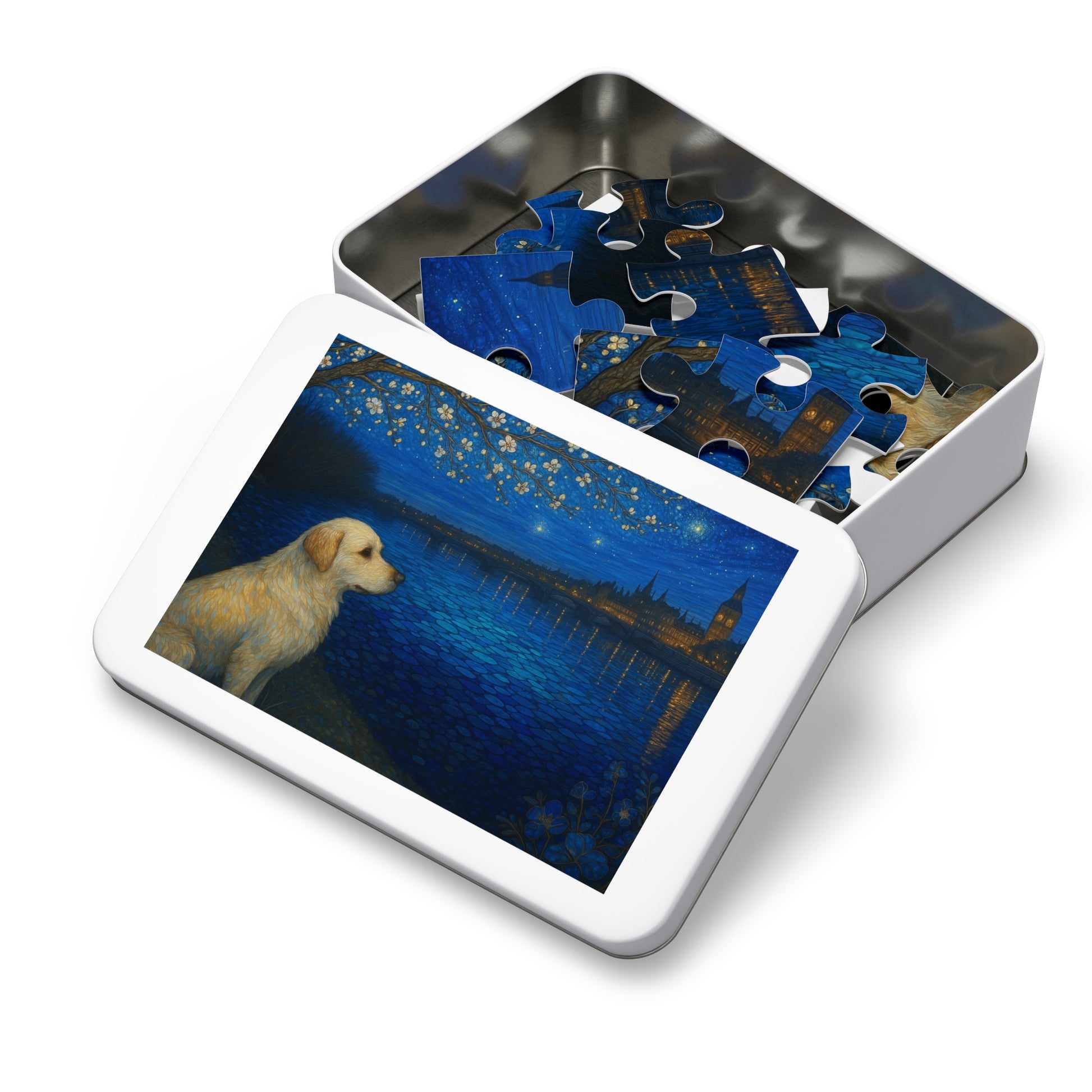 On a quiet embankment, a golden dog watches the Thames glow—swirls of starlight ripple across blue water, cherry blossoms arc overhead, and warm city lights span the bridge beyond. Calm, tender, and richly textured, this nightscape balances intimacy with grandeur.