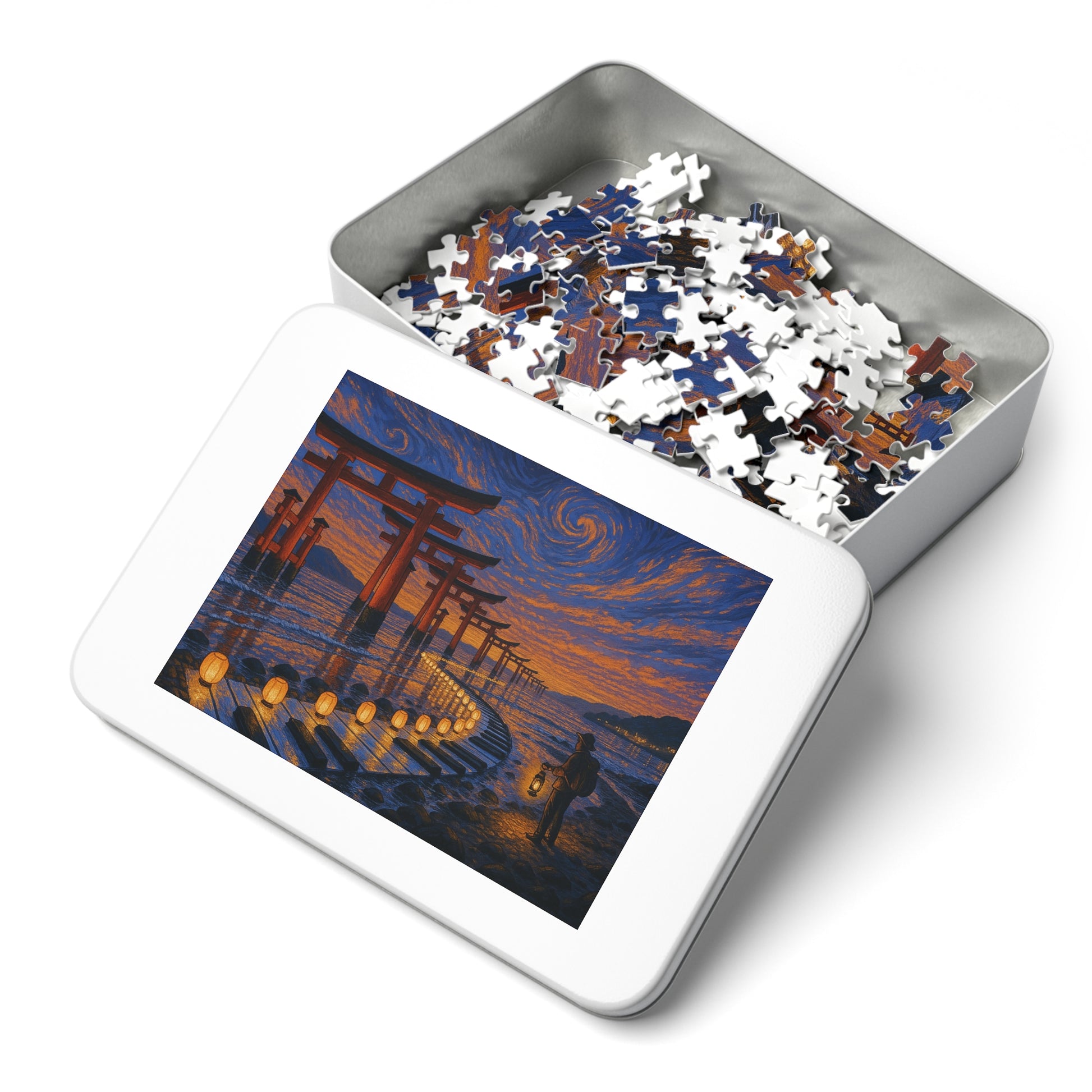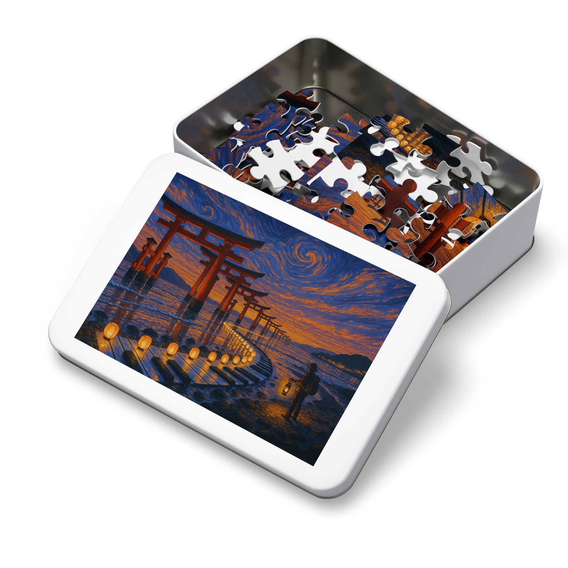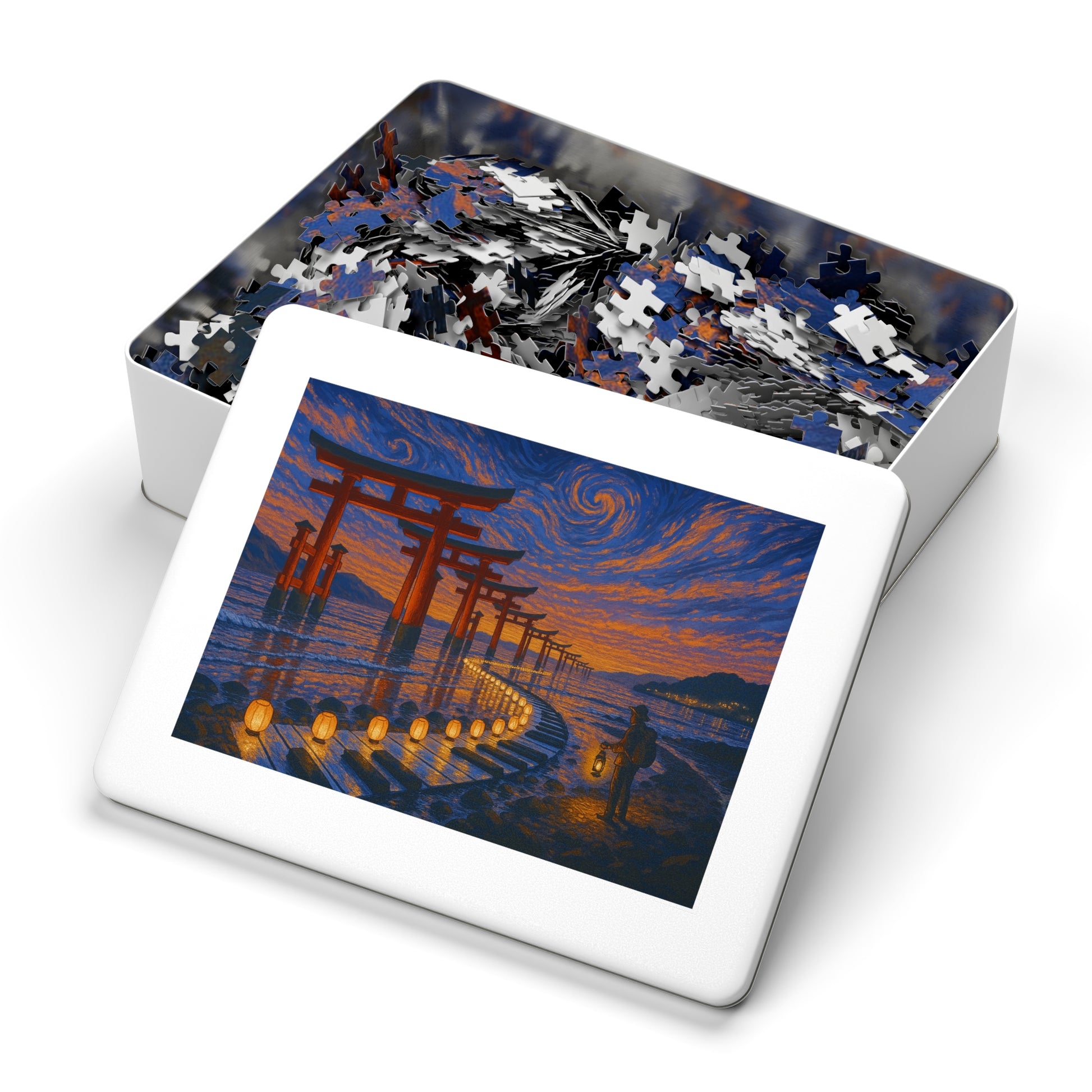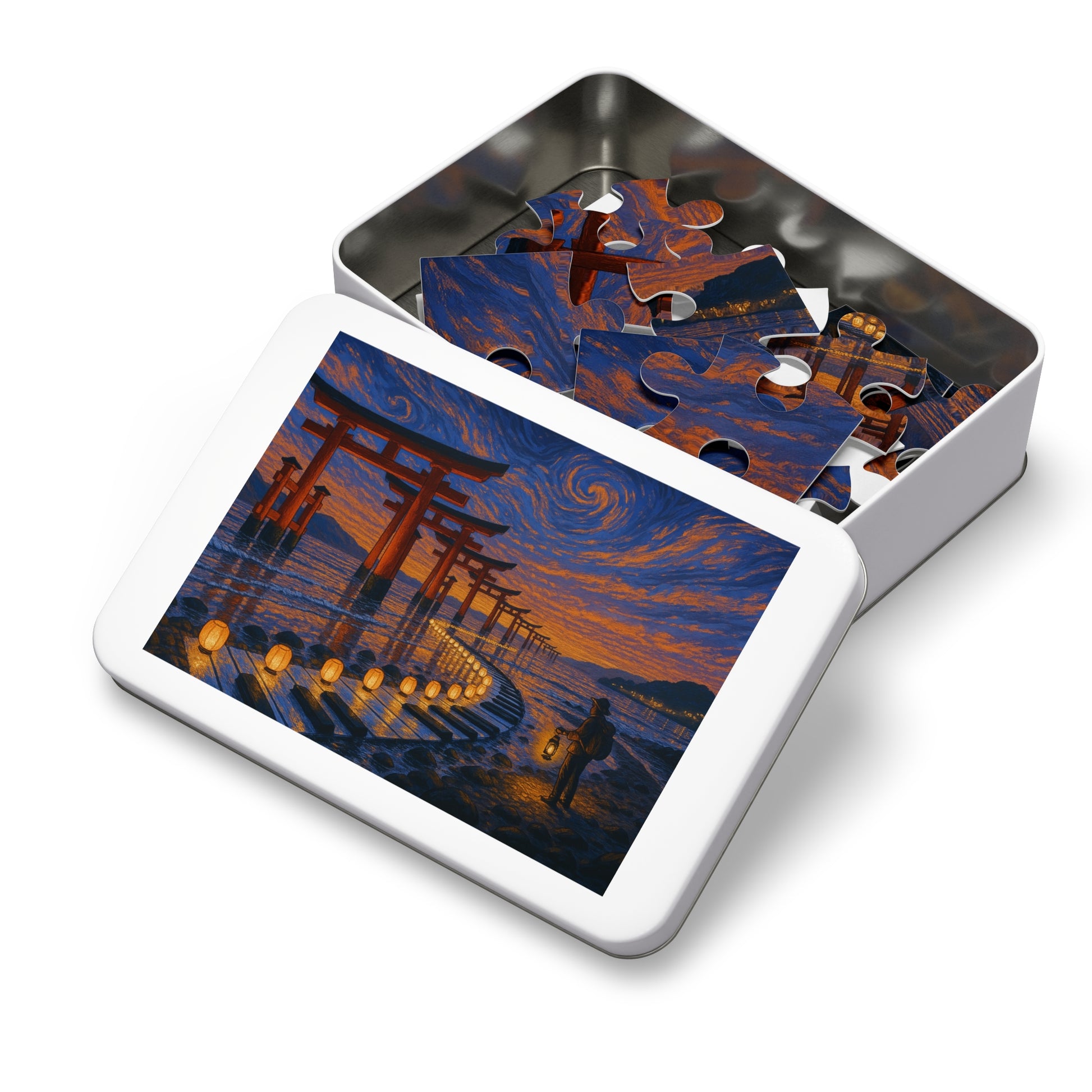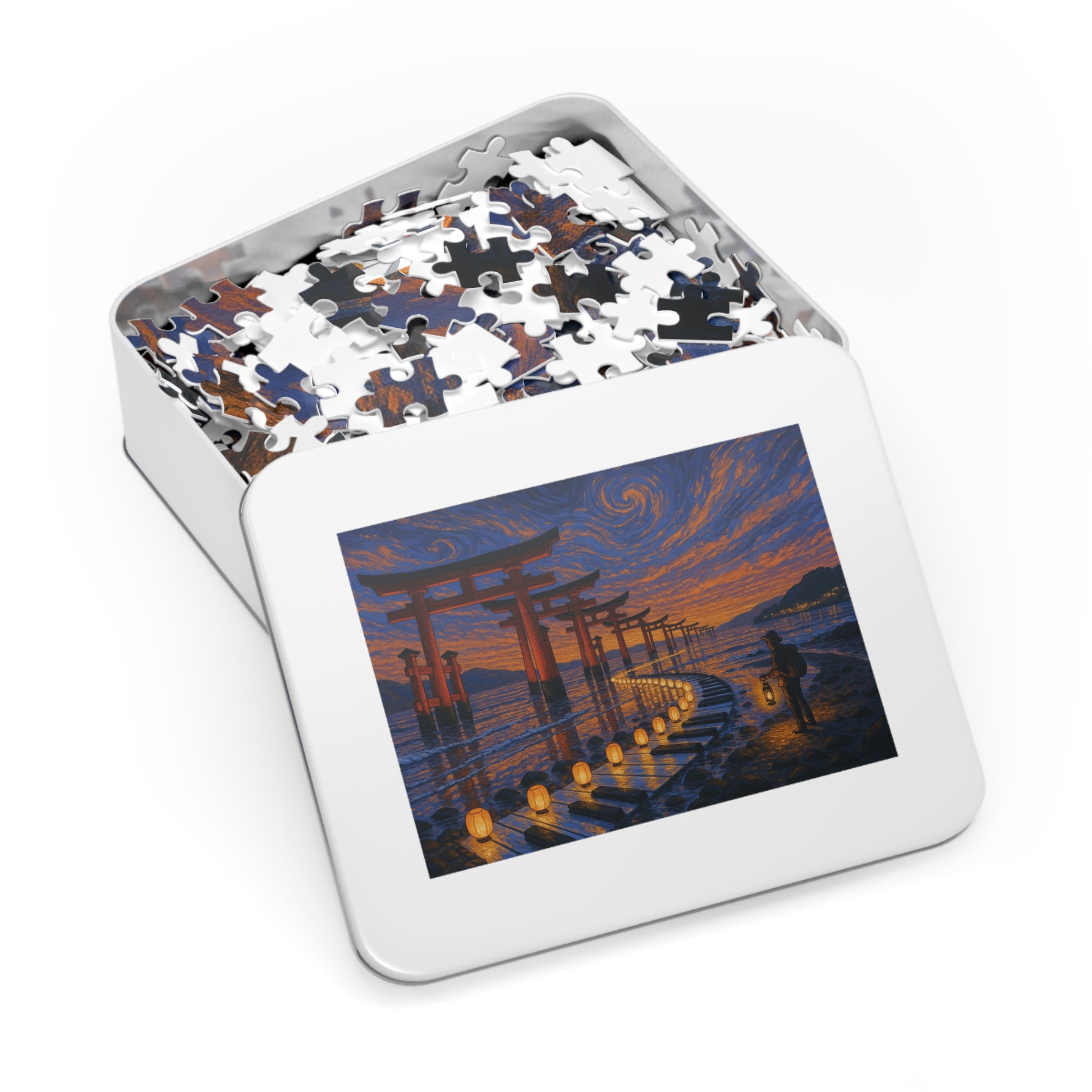 Vermilion torii stride into the tide beneath an apricot-to-navy sky of swirling strokes. On the wet stones, paper lanterns trace a luminous ribbon that curves like a melody, leading a lone traveler with a lantern toward the horizon. Reflections ripple softly, holding a calm, reverent glow.