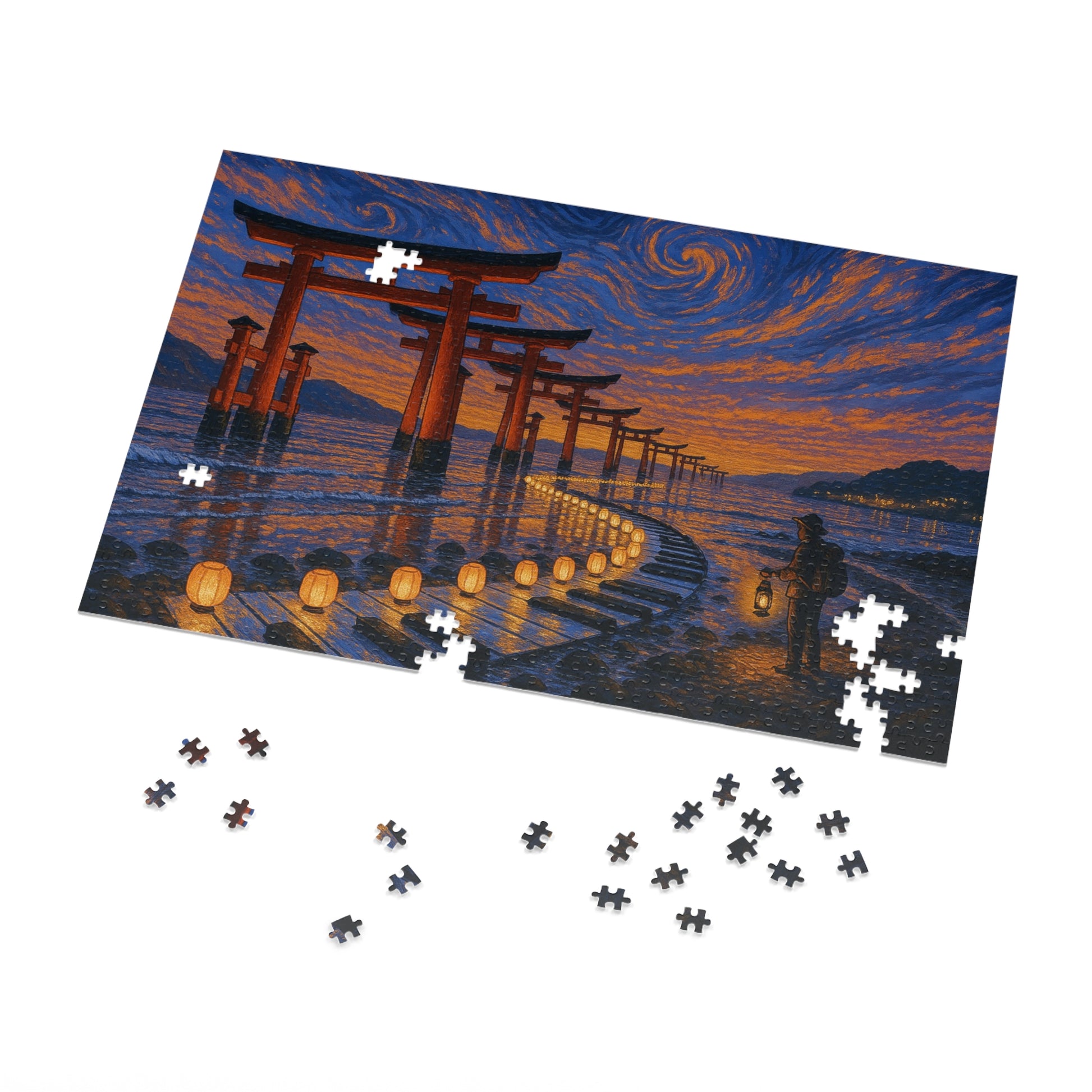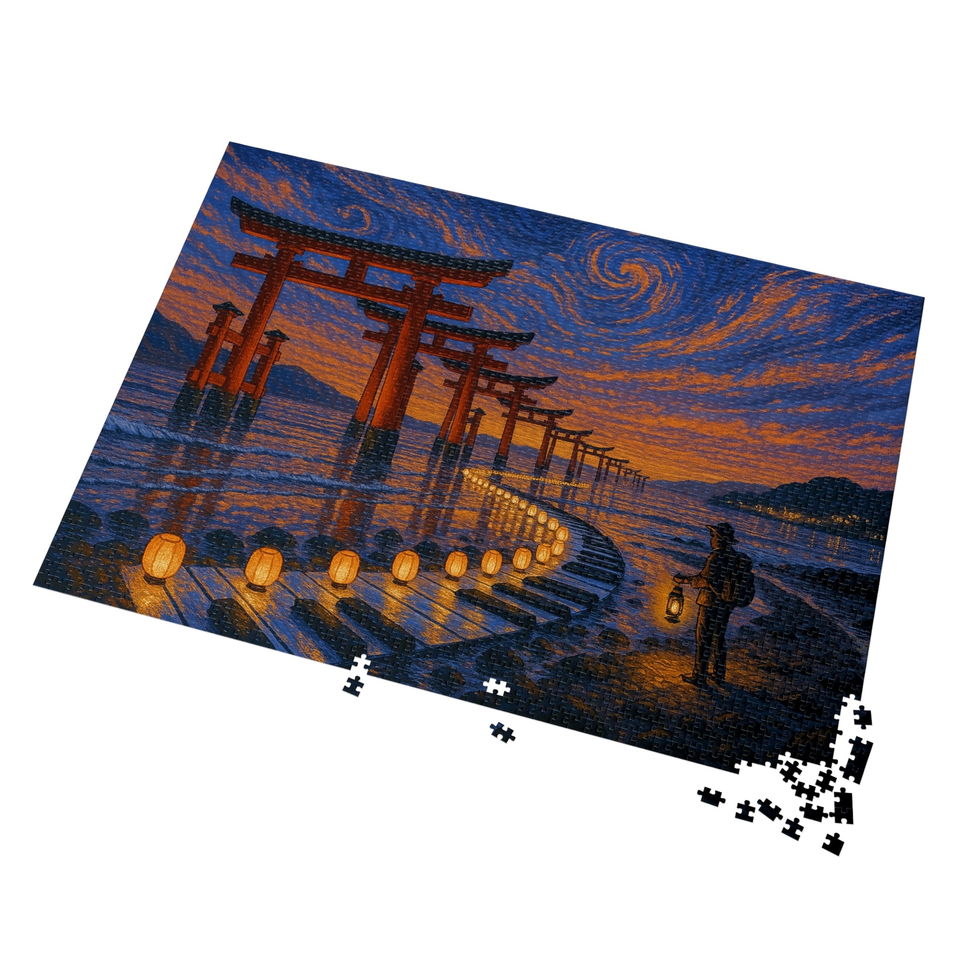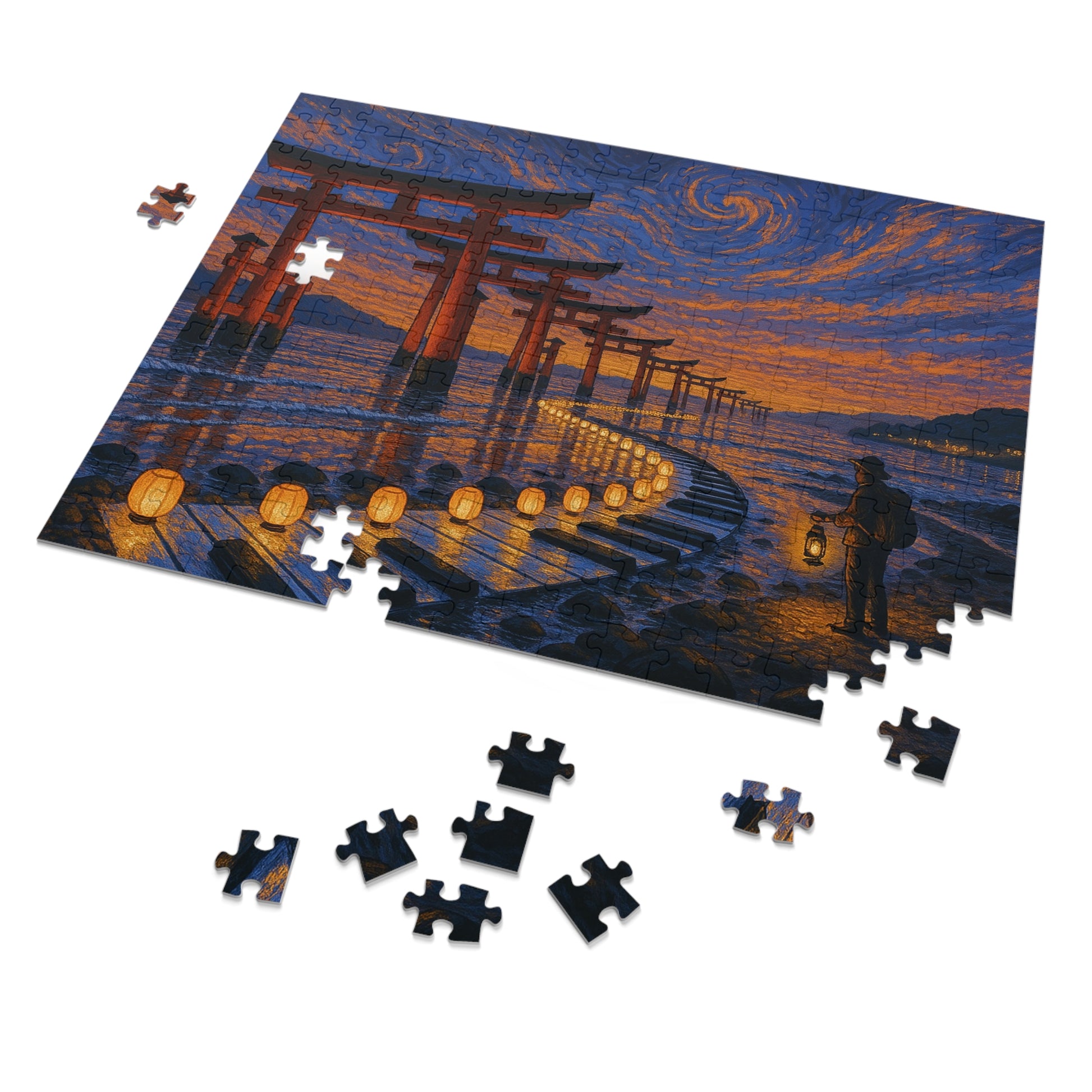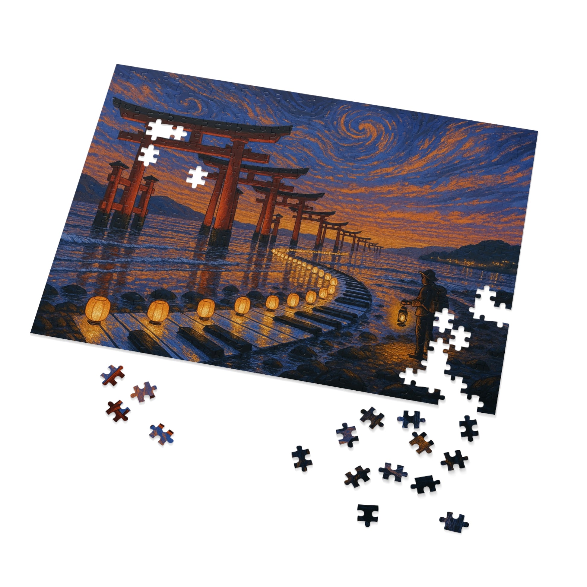 Natural zones—sky, gates, lantern path, shoreline—make sorting intuitive. The gentle S-curve guides assembly from foreground to far distance with a soothing cadence.