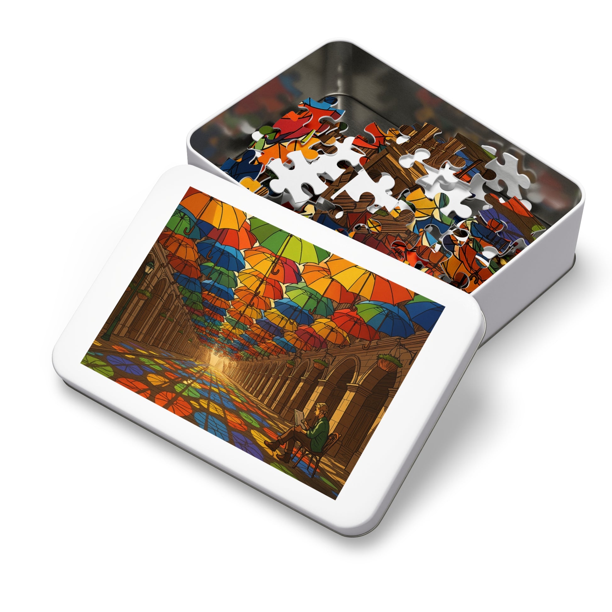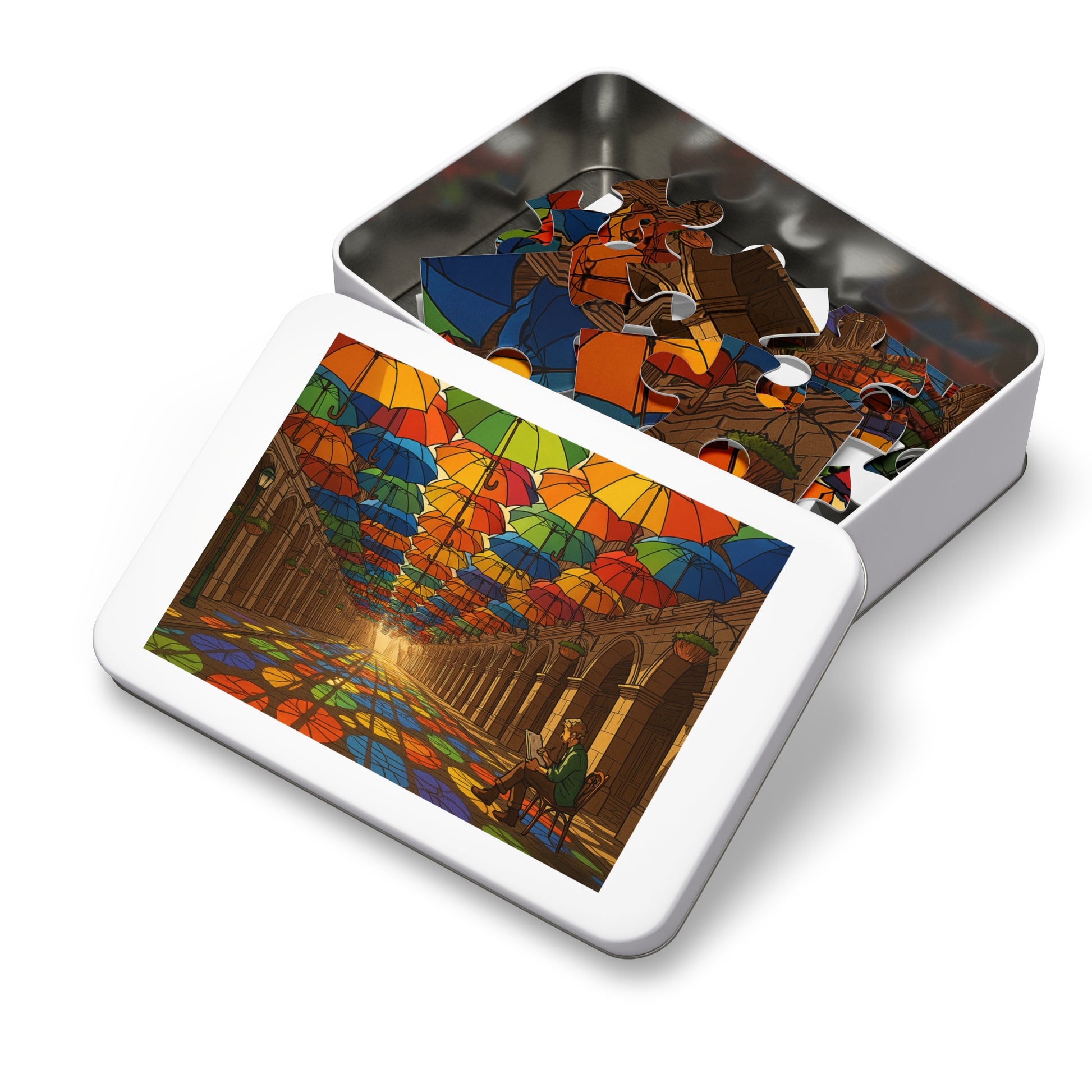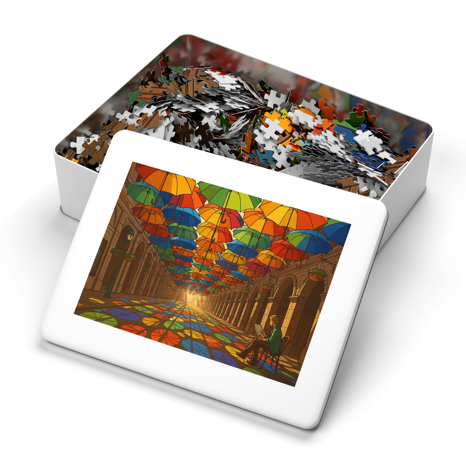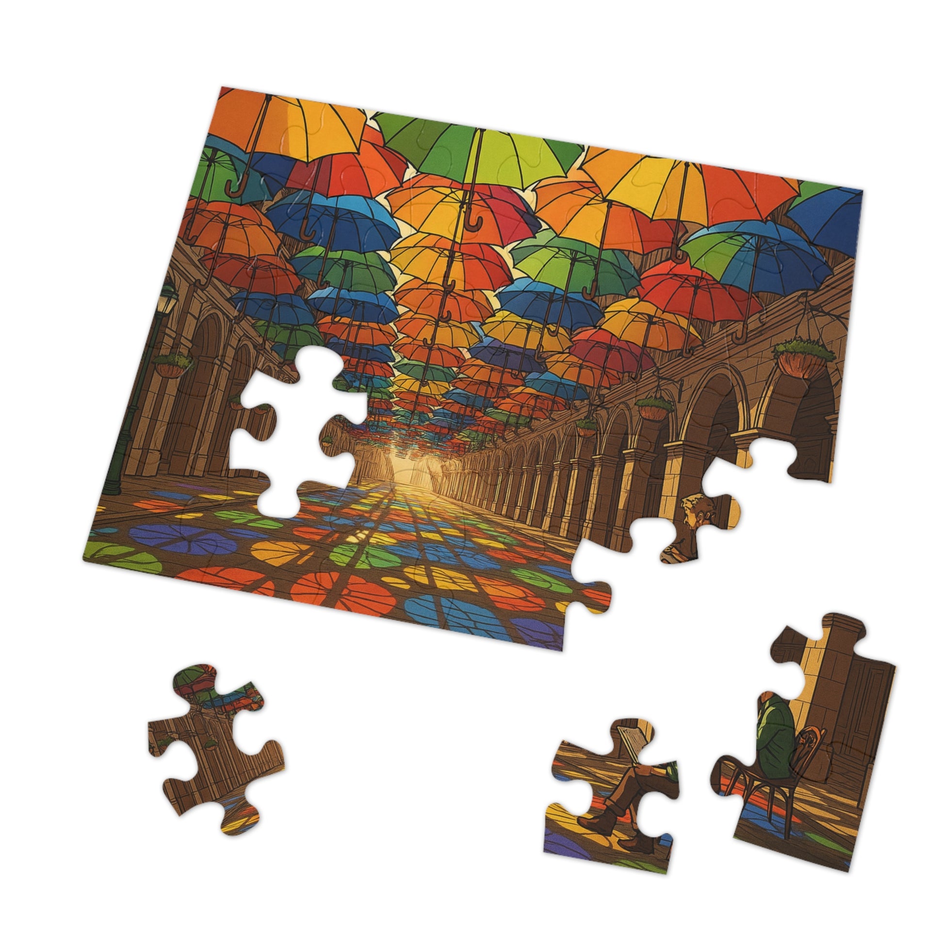 This vibrant puzzle depicts hundreds of umbrellas suspended overhead, forming a rainbow canopy above a stone arcade. Sunlight filters through in brilliant hues, casting stained-glass-like reflections across the floor. At the edge of the scene, a quiet sketcher captures the moment, balancing human stillness against the playful geometry of light and shadow. With crisp line work and soft cel shading, this artwork radiates both energy and calm.